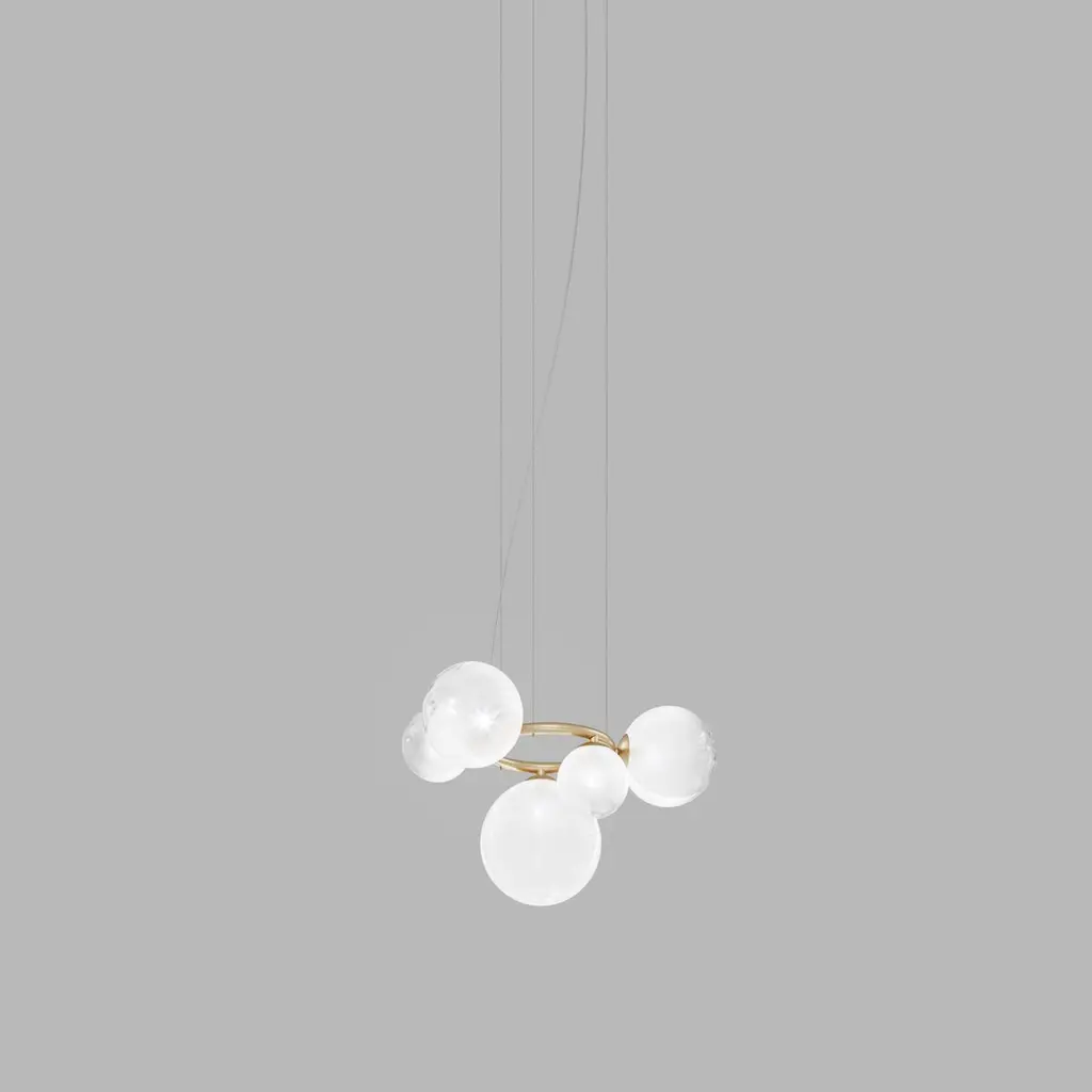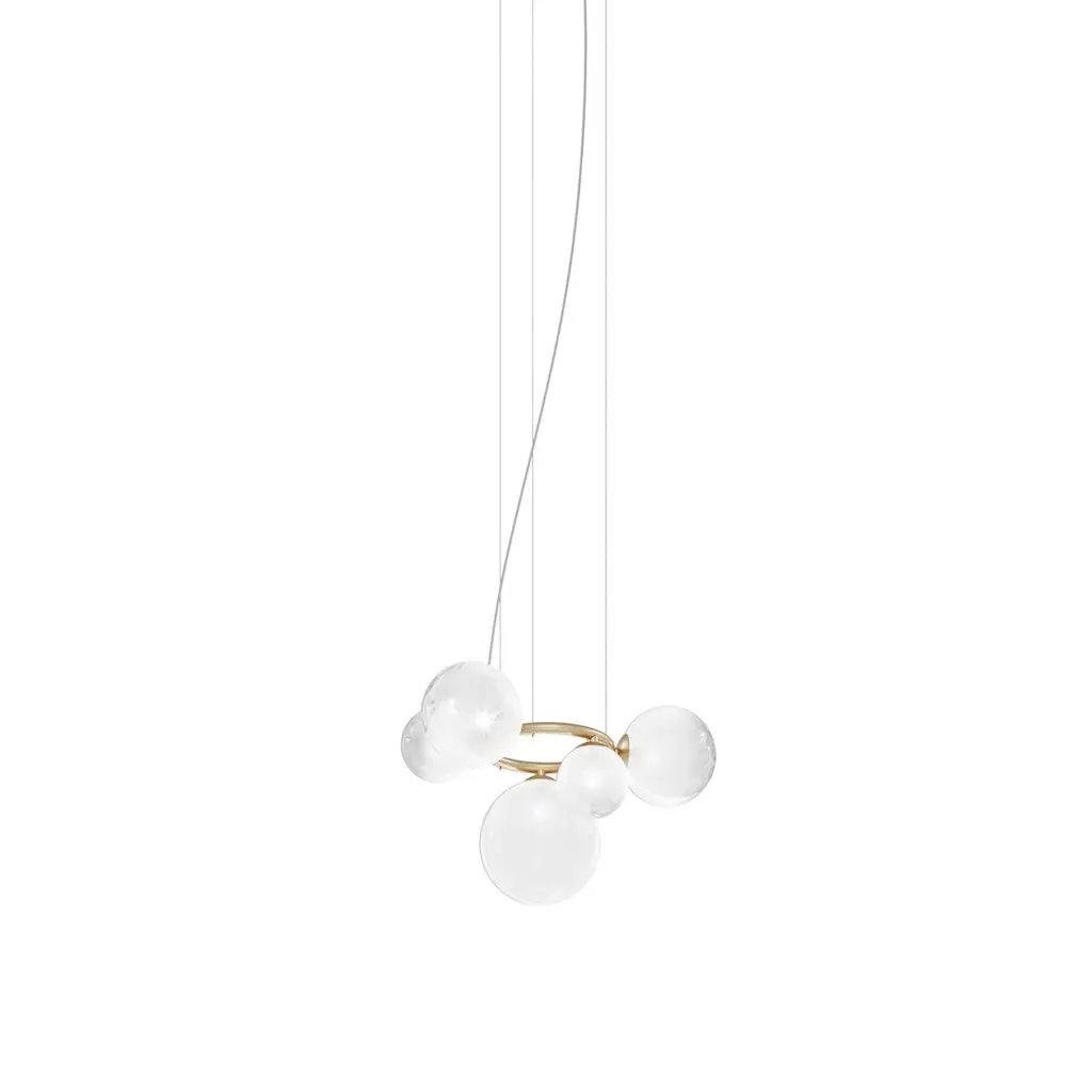 The distinctive feature of this model from the Puppet Ring collection are the rings with increasing diameter. They can be combined in different sequences to form the framework on which the precious glass spheres in three different sizes are placed, blending with the structure thanks to a preformation inside the blown glass. Aesthetically light and elegant, Puppet Ring ethereally combines crystal, smoky, amber and shaded white glass with gold and black matt nickel finishes.Specifications:Material: GlassLight source: G9 ULNo of bulbs: 5x60W G9 UL (120V/60HZ)Dimmer: DIM 1Year: 2019Glass finish: White ShadedFrame finish: Matt Gold 3Dimensions: 72 W x 57 D x 43 H cmCable length: 200 cmAvailable in other glass finish options: Amber Transparent, Crystal Transparent, Smoky TransparentAvailable in other frame finish option: Matt black nickelPlease inquire about customization options.