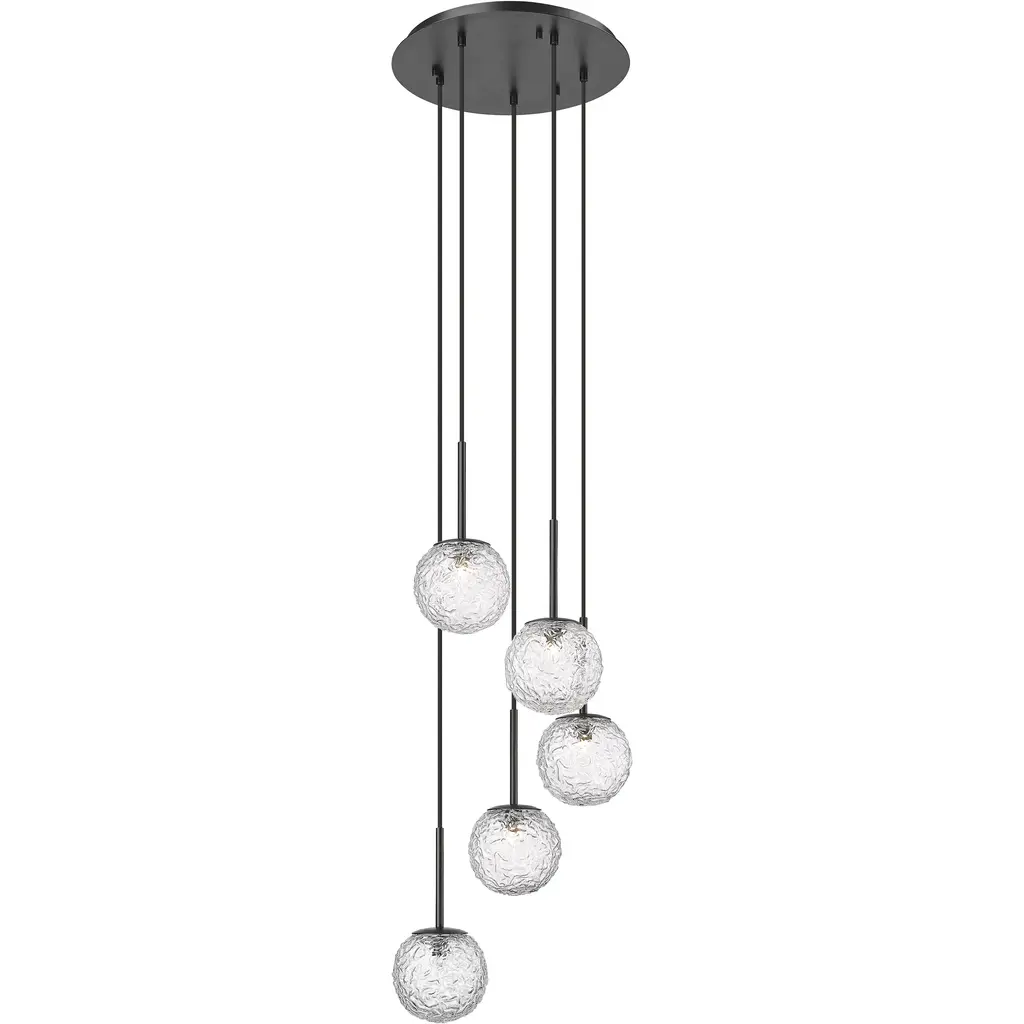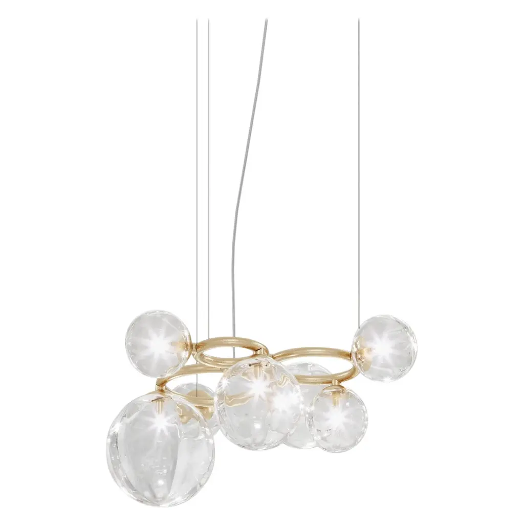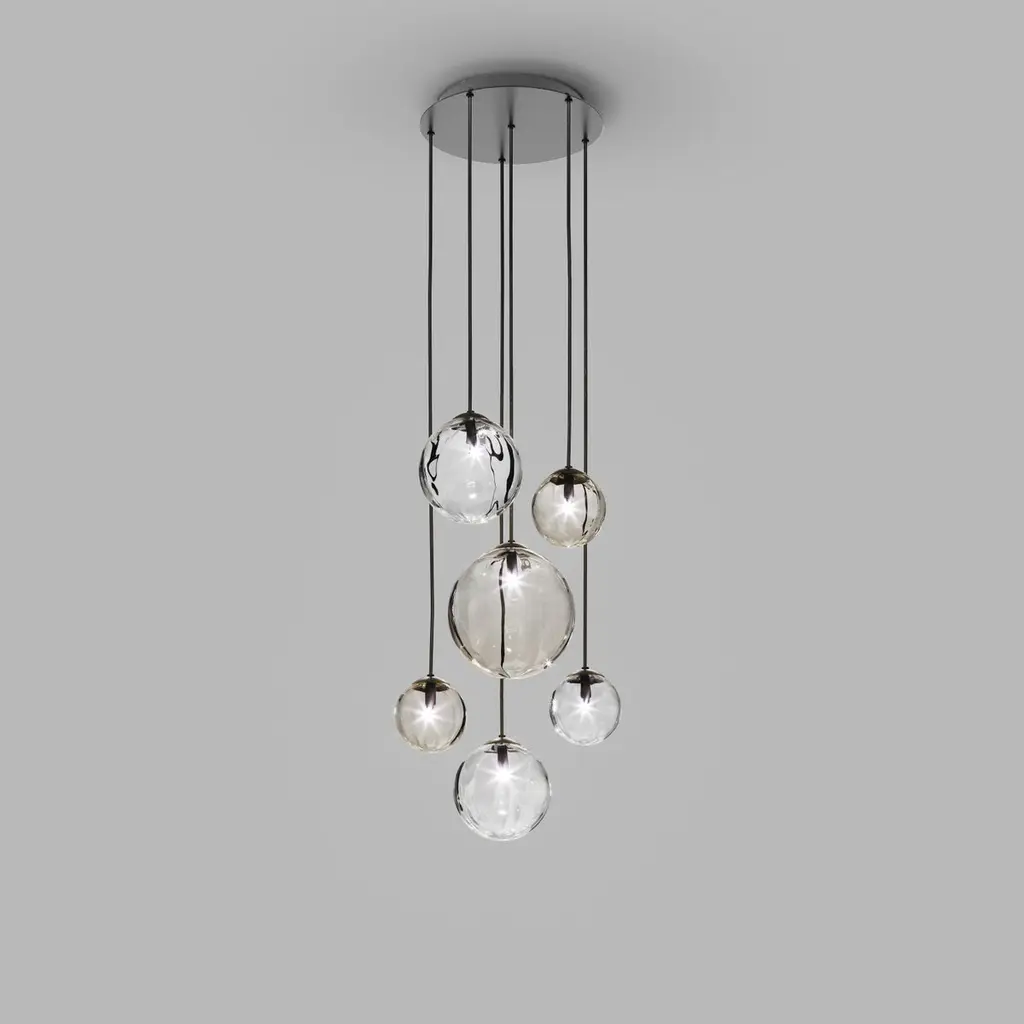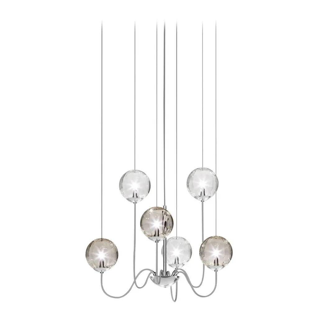 Collection of lamps with a blown and irregular striped glass diffuser. The three sizes of the spheres and the different cable heights are designed to create elegant compositions. The chandelier version allows to fix the diffusers with steel cables to the ceiling, creating different games.Specifications:Material: Glass, chromeLight source: G9 ULNo of bulbs: 6x60W G9 UL (120V/60HZ)Dimmer: DIM 1Year: 2015Glass finish: Multicolor 3Frame finish: Glossy ChromeDimensions: Ø 58 x 90 H cmCable length: 110 cmAvailable in other glass finish options: Amber Transparent, White Shaded, Crystal Transparent, Smoky Transparent, Multicolor 1, Multicolor 2Available in other frame finish option: Matt Black 1 Available in other size options: Ø 16, Ø 28, Ø 22, 91x35, 136x38, Ø 83, Ø 108, Ø 50Please inquire about customization options.