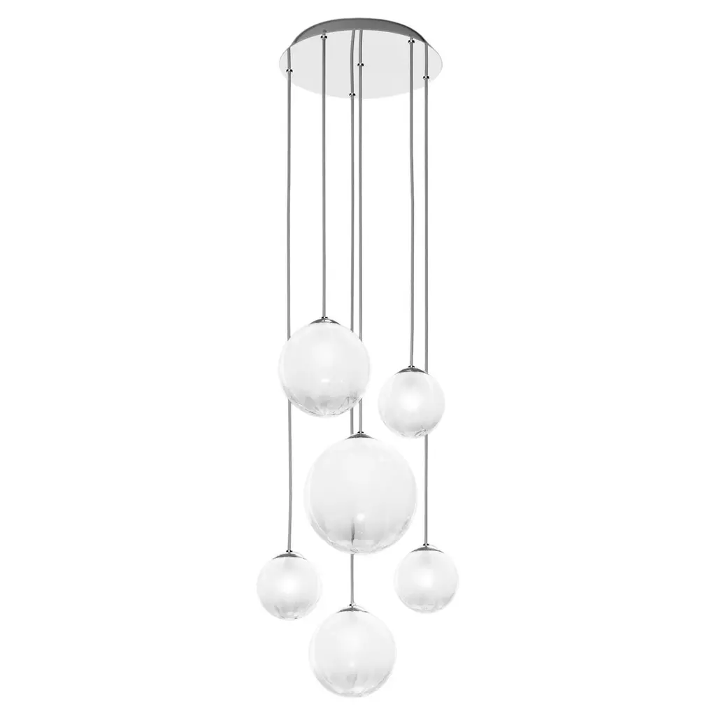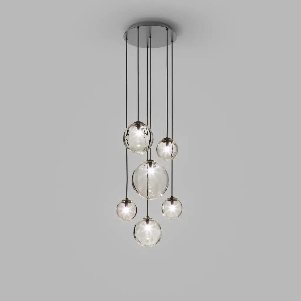 Collection of lamps with a blown and irregular striped glass diffuser. The three sizes of the spheres and the different cable heights are designed to create elegant compositions. The chandelier version allows to fix the diffusers with steel cables to the ceiling, creating different games.Specifications:Material: Glass, chromeLight source: G9 ULNo of bulbs: 6x60W G9 UL (120V/60HZ)Dimmer: DIM 1Year: 2015Glass finish: Smoky TransparentFrame finish: Glossy ChromeDimensions: Ø 58 x 90 H cmCable length: 110 cmAvailable in other glass finish options: Amber Transparent, White Shaded, Crystal Transparent, Multicolor 1, Multicolor 2, Multicolor 3Available in other frame finish option: Matt Black 1 Available in other size options: Ø 16, Ø 28, Ø 22, 91x35, 136x38, Ø 83, Ø 108, Ø 50Please inquire about customization options.