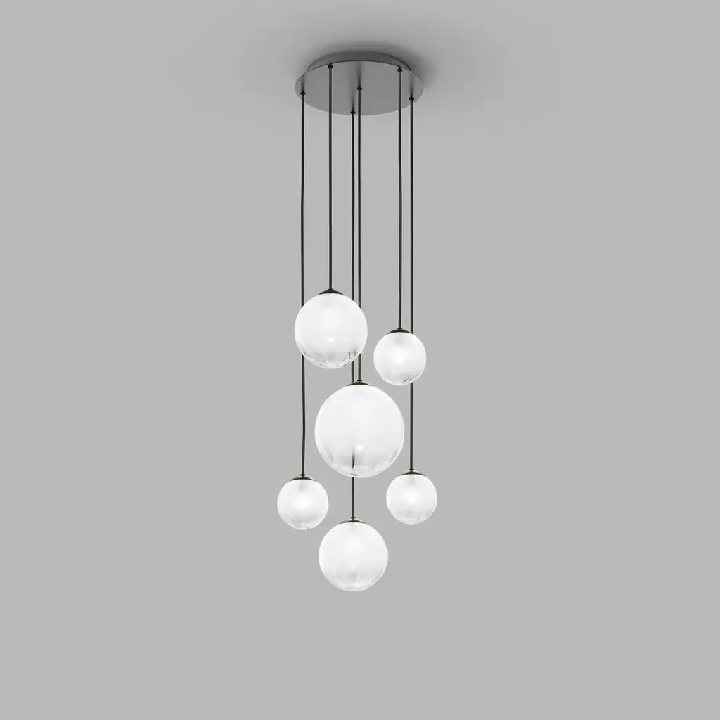 Collection of lamps with a blown and irregular striped glass diffuser. The three sizes of the spheres and the different cable heights are designed to create elegant compositions. The chandelier version allows to fix the diffusers with steel cables to the ceiling, creating different games.Specifications:Material: Glass, chromeLight source: G9 ULNo of bulbs: 6x60W G9 UL (120V/60HZ)Dimmer: DIM 1Year: 2015Glass finish: White ShadedFrame finish: Glossy ChromeDimensions: Ø 58 x 90 H cmCable length: 110 cmAvailable in other glass finish options: Amber Transparent, Crystal Transparent, Smoky Transparent, Multicolor 1, Multicolor 2, Multicolor 3Available in other frame finish option: Matt Black 1 Available in other size options: Ø 16, Ø 28, Ø 22, 91x35, 136x38, Ø 83, Ø 108, Ø 50Please inquire about customization options.
