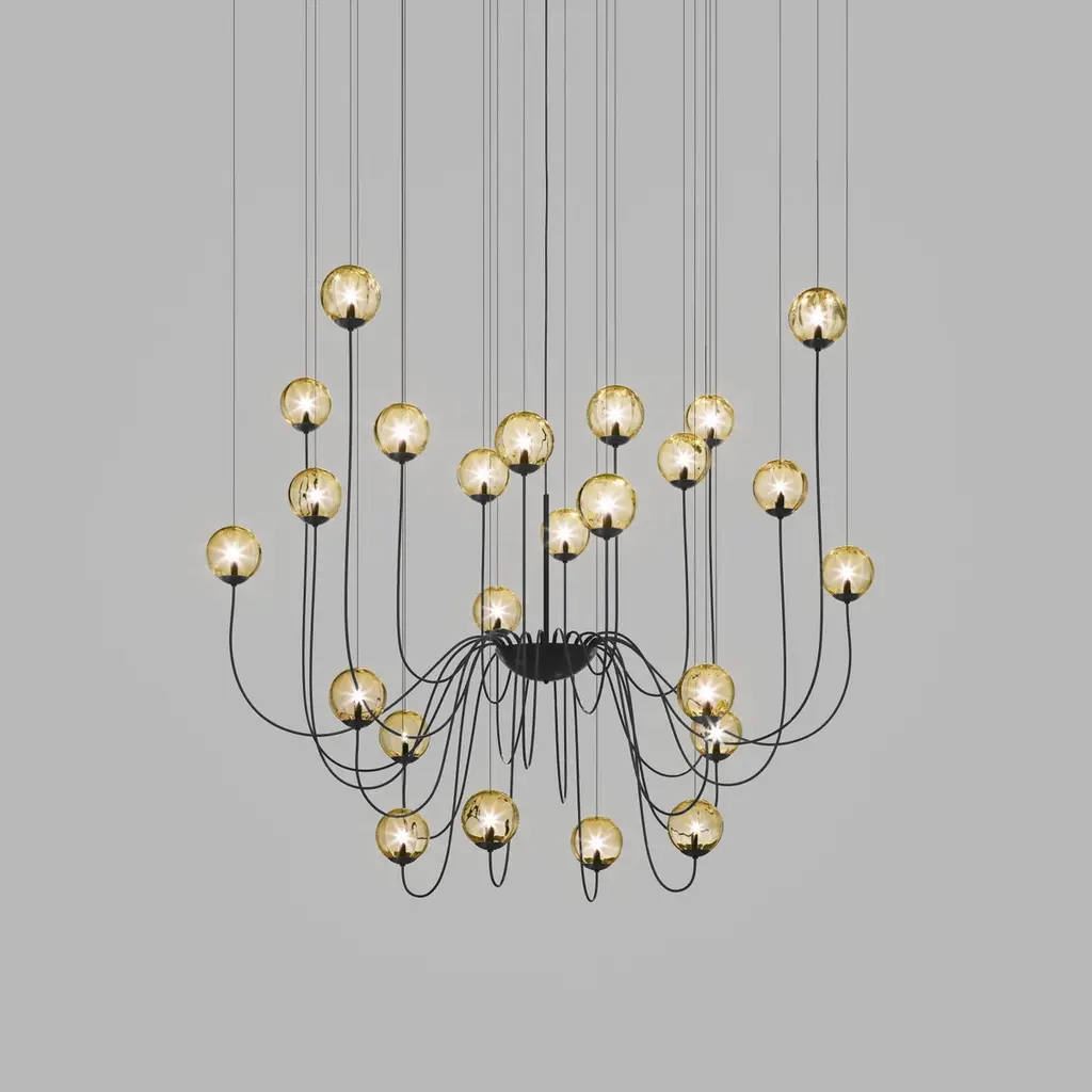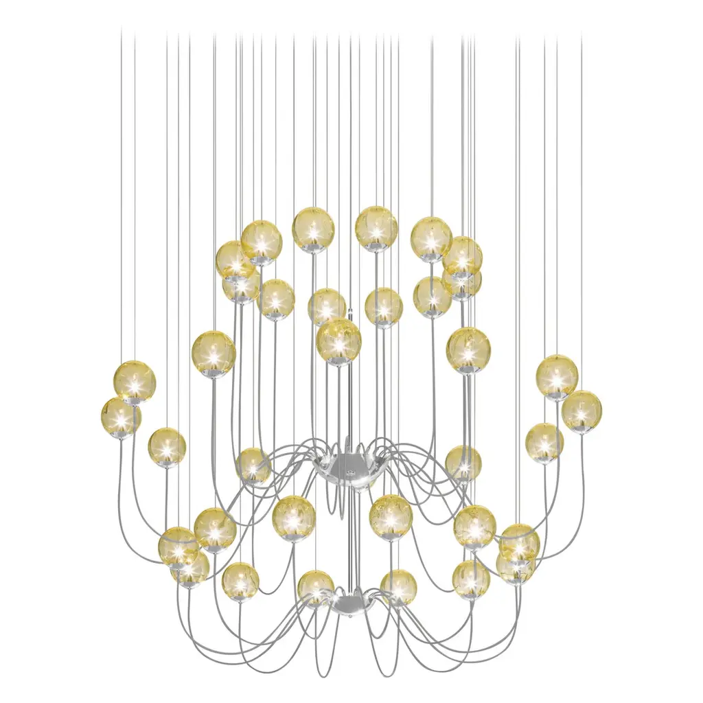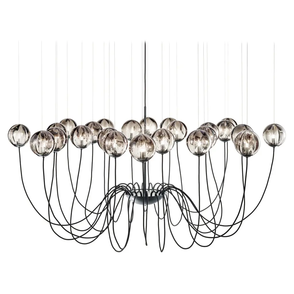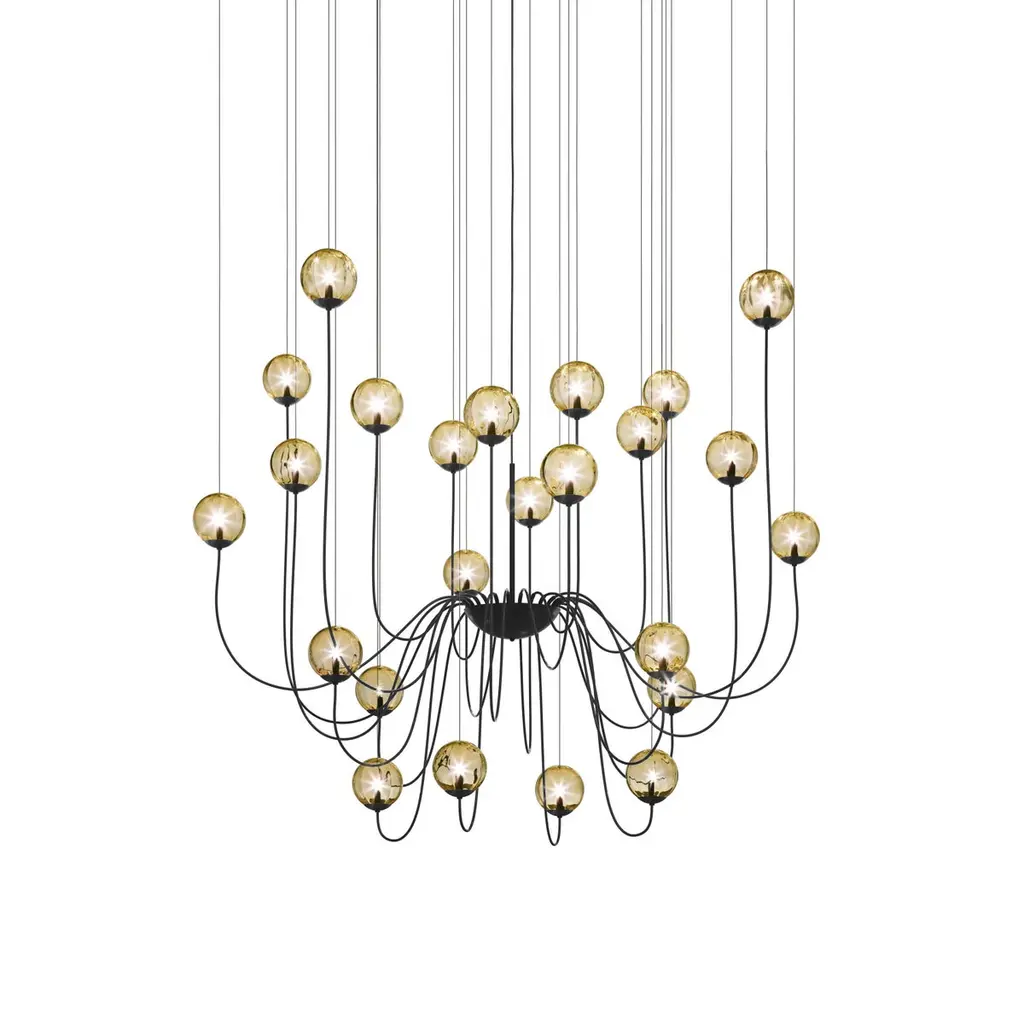 Collection of lamps with a blown and irregular striped glass diffuser. The three sizes of the spheres and the different cable heights are designed to create elegant compositions. The chandelier version allows to fix the diffusers with steel cables to the ceiling, creating different games.Specifications:Material: GlassLight source: G9 ULNo of bulbs: 24×25W G9 UL (120V/60HZ)Dimmer: DIM 1Year: 2015Glass finish: Amber TransparentFrame finish: Matt Black 1Dimensions: Ø 190 x 160 H cmCable length: 180 cmAvailable in other glass finish options: White Shaded, Crystal Transparent, Smoky Transparent, Multicolor 1, Multicolor 2, Multicolor 3Available in other frame finish option: Glossy ChromePlease inquire about customization options.