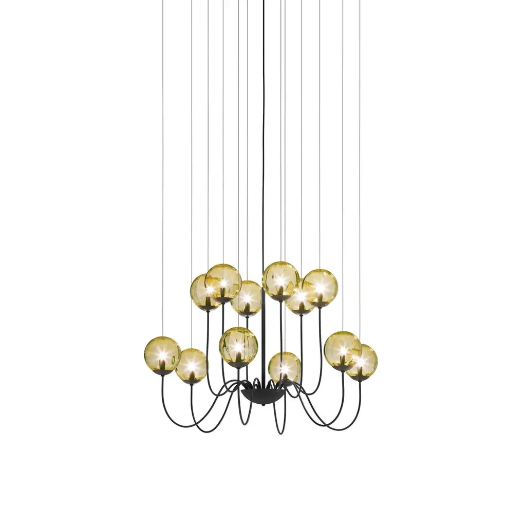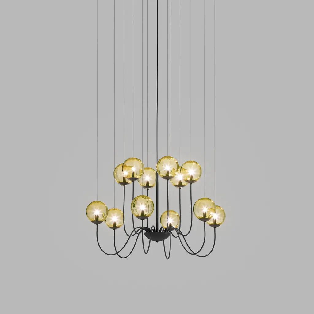 Collection of lamps with a blown and irregular striped glass diffuser. The three sizes of the spheres and the different cable heights are designed to create elegant compositions. The chandelier version allows to fix the diffusers with steel cables to the ceiling, creating different games.Specifications:Material: GlassLight source: G9 ULNo of bulbs: 12×60W G9 UL (120V/60HZ)Dimmer: DIM 1Year: 2015Glass finish: Amber TransparentFrame finish: Matt Black 1Dimensions: Ø 130 x 100 H cmCable length: 230 cmAvailable in other glass finish options: White Shaded, Crystal Transparent, Smoky Transparent, Multicolor 1, Multicolor 2, Multicolor 3Available in other frame finish option: Glossy ChromePlease inquire about customization options.