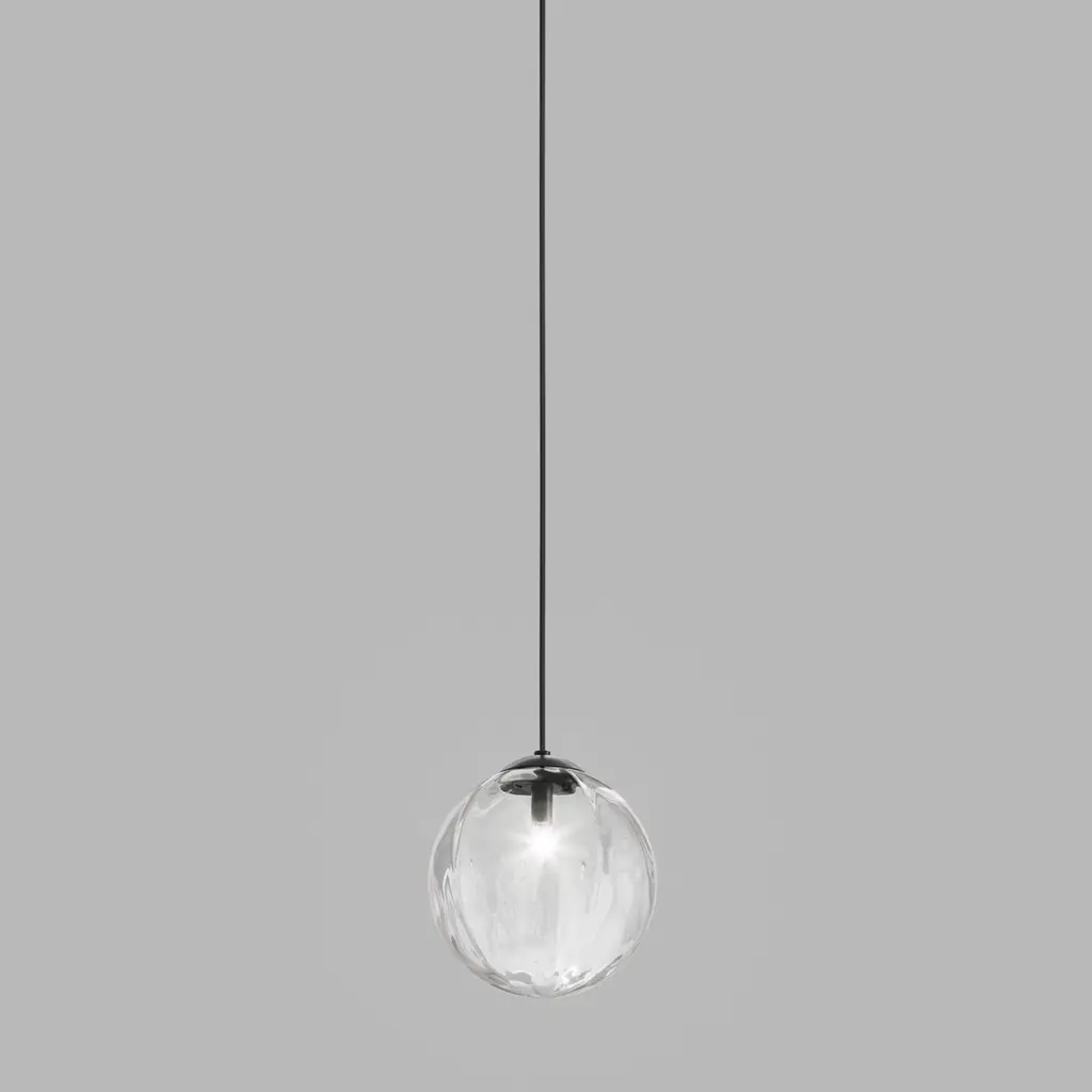 Collection of lamps with a blown and irregular striped glass diffuser. The three sizes of the spheres and the different cable heights are designed to create elegant compositions. The chandelier version allows to fix the diffusers with steel cables to the ceiling, creating different games.Specifications:Material: GlassLight source: G9 ULNo of bulbs: 1x60W G9 UL (120V/60HZ)Dimmer: DIM 1Year: 2015Glass finish: Crystal TransparentFrame finish: Matt Black 1Dimensions: Ø 16 x 16 H cmCable length: 200 cmAvailable in other glass finish options: Amber Transparent, White Shaded, Smoky Transparent, Multicolor 1, Multicolor 2, Multicolor 3Available in other frame finish option: Glossy Chrome Available in other size options: Ø 22, Ø 28, 91x35, 136x38, Ø 83, Ø 108, Ø 50, Ø 58Please inquire about customization options.