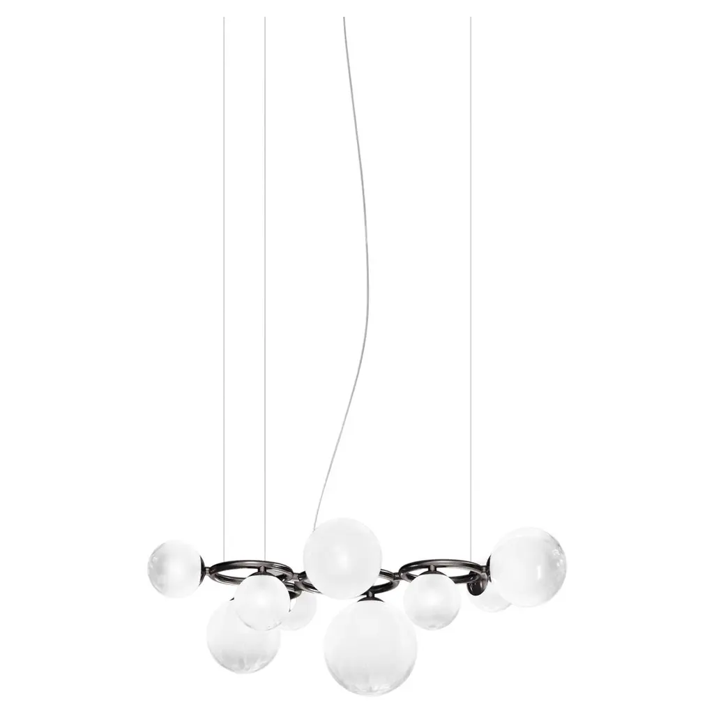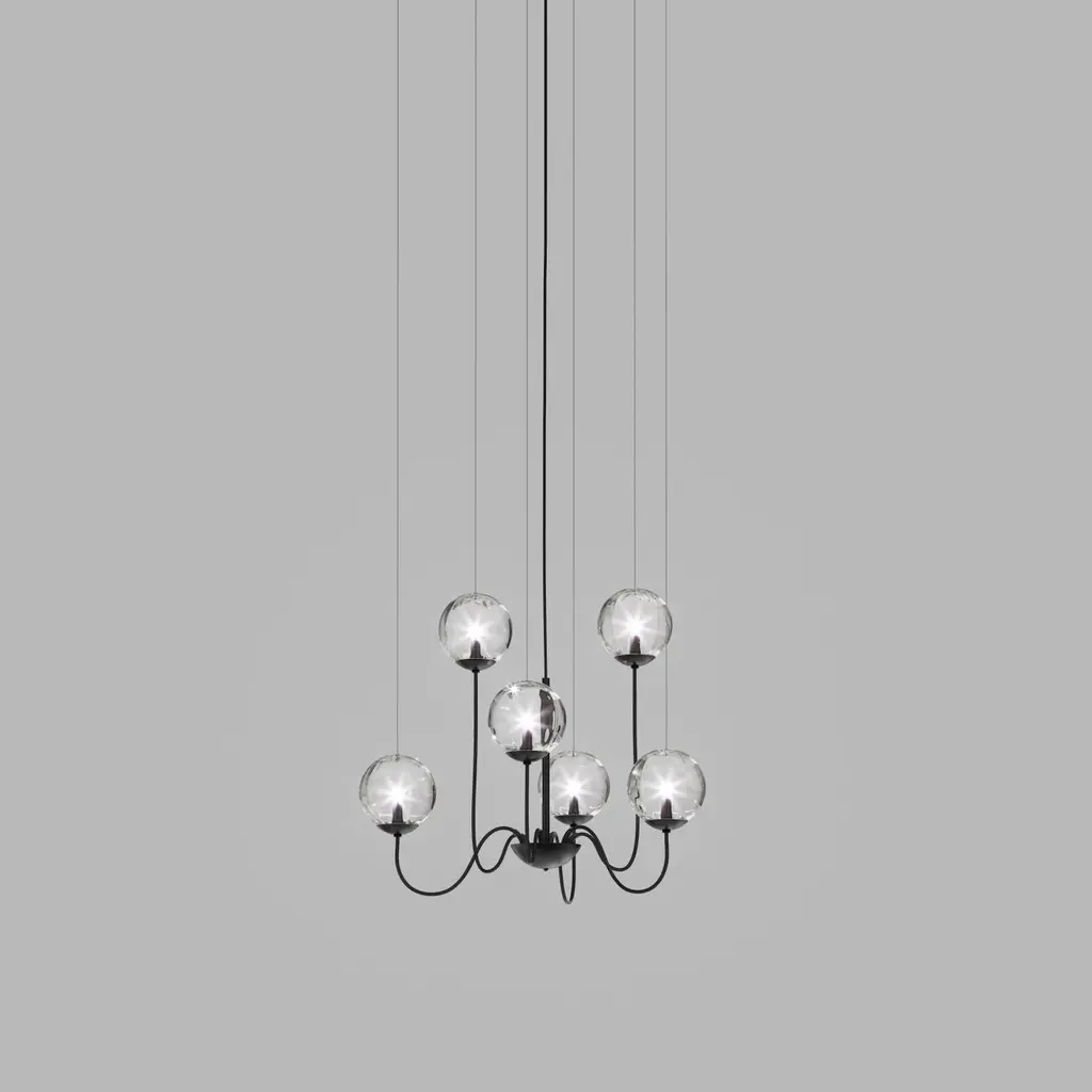 Collection of lamps with a blown and irregular striped glass diffuser. The three sizes of the spheres and the different cable heights are designed to create elegant compositions. The chandelier version allows to fix the diffusers with steel cables to the ceiling, creating different games.Specifications:Material: GlassLight source: G9 ULNo of bulbs: 6×60W G9 UL (120V/60HZ)Dimmer: DIM 1Year: 2015Glass finish: Crystal TransparentFrame finish: Matt Black 1Dimensions: Ø 80 x 80 H cmCable length: 150 cmAvailable in other glass finish options: White Shaded, Amber Transparent, Smoky Transparent, Multicolor 1, Multicolor 2, Multicolor 3Available in other frame finish option: Glossy ChromePlease inquire about customization options.