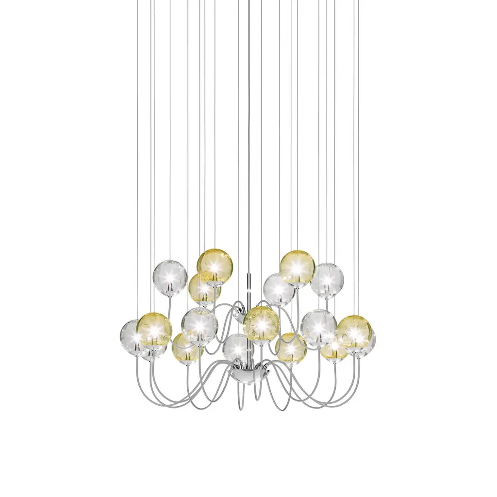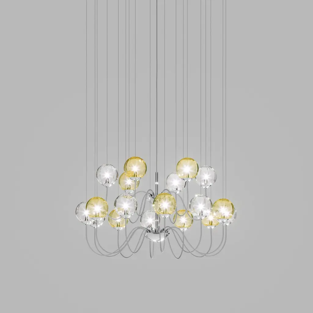 Collection of lamps with a blown and irregular striped glass diffuser. The three sizes of the spheres and the different cable heights are designed to create elegant compositions. The chandelier version allows to fix the diffusers with steel cables to the ceiling, creating different games.Specifications:Material: GlassLight source: G9 ULNo of bulbs: 18×40W G9 UL (120V/60HZ)Dimmer: DIM 1Year: 2015Glass finish: Multicolor 2Frame finish: Glossy chromeDimensions: Ø 130 x 130 H cmCable length: 200 cmAvailable in other glass finish options: White Shaded, Amber Transparent, Crystal Transparent, Smoky Transparent, Multicolor 1, Multicolor 3Available in other frame finish option: Matt Black 1Please inquire about customization options.