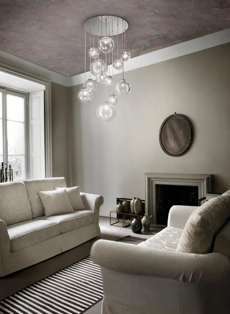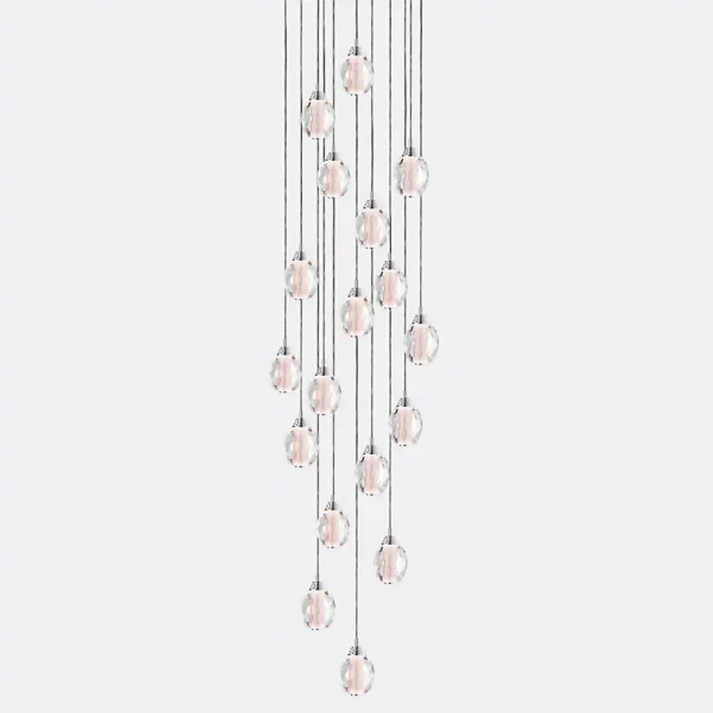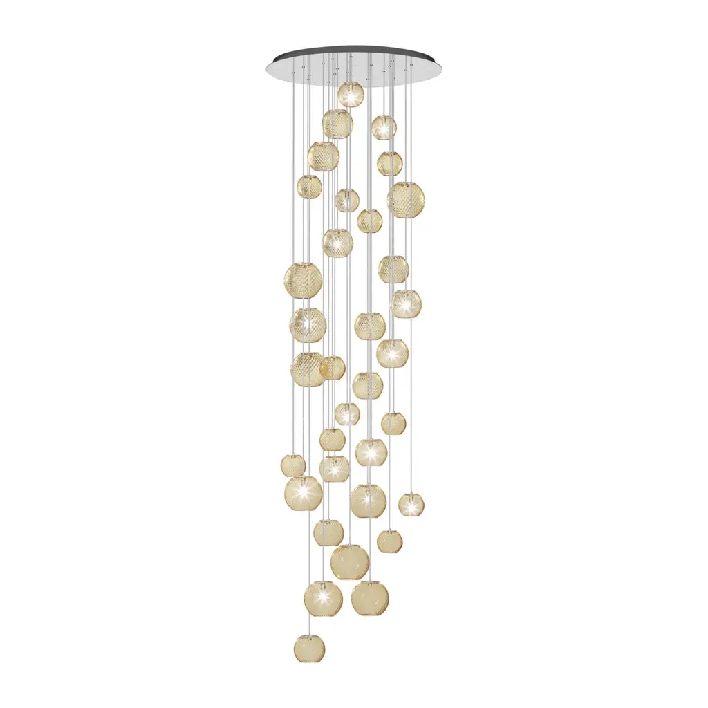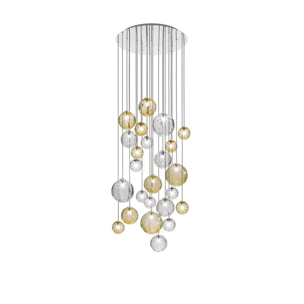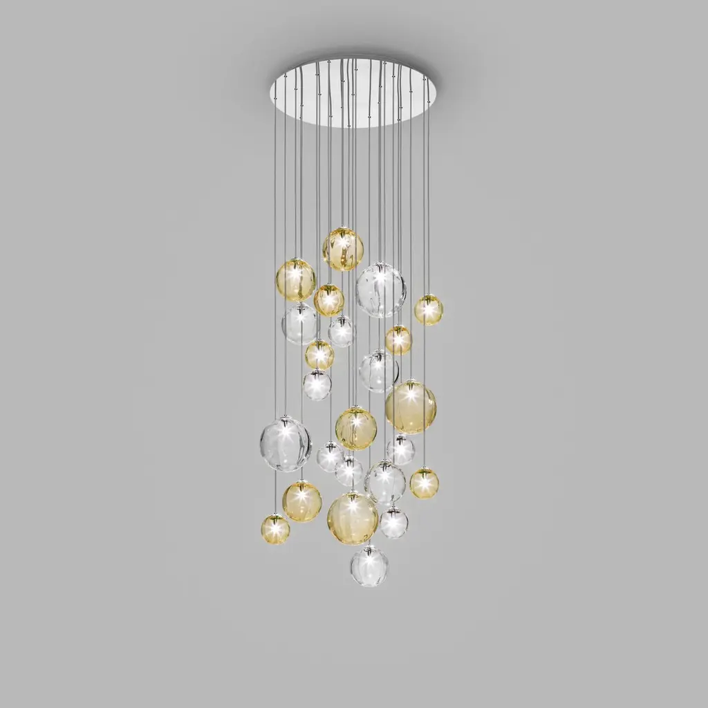 Collection of lamps with a blown and irregular striped glass diffuser. The three sizes of the spheres and the different cable heights are designed to create elegant compositions. The chandelier version allows to fix the diffusers with steel cables to the ceiling, creating different games.Specifications:Material: Glass, chromeLight source: G9 ULNo of bulbs: 24x25W G9 UL (120V/60HZ)Dimmer: DIM 1Year: 2015Glass finish: Multicolor 2Frame finish: Glossy ChromeDimensions: Ø 108 x 200 H cmCable length: 100 cmAvailable in other glass finish options: Amber Transparent, White Shaded, Crystal Transparent, Smoky Transparent, Multicolor 1, Multicolor 3Available in other frame finish option: Matt Black 1 Available in other size options: Ø 16, Ø 28, Ø 22, 91x35, 136x38, Ø 58, Ø 83, Ø 50Please inquire about customization options.