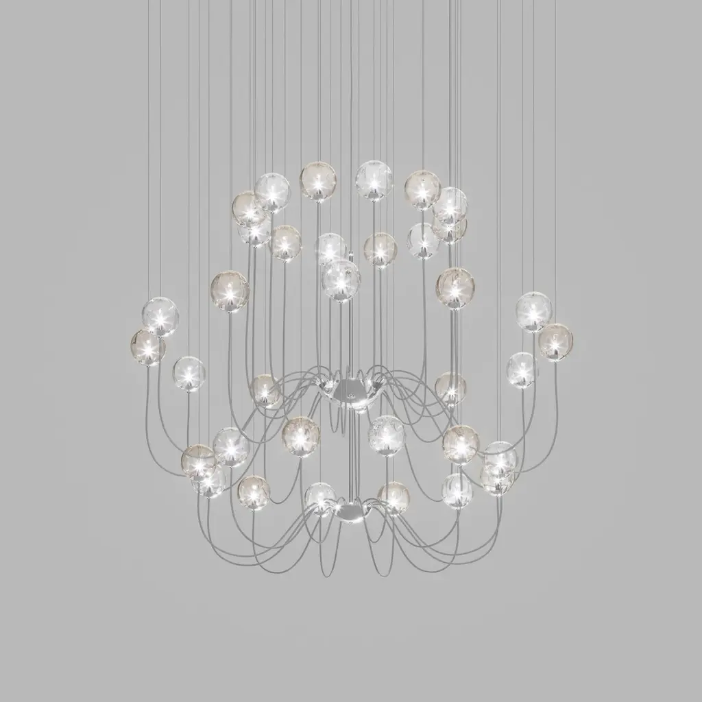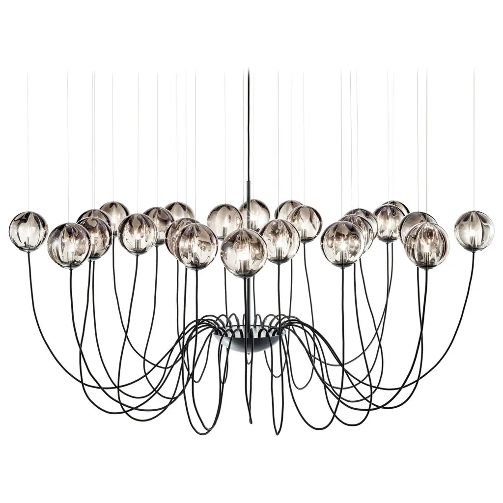 Collection of lamps with a blown and irregular striped glass diffuser. The three sizes of the spheres and the different cable heights are designed to create elegant compositions. The chandelier version allows to fix the diffusers with steel cables to the ceiling, creating different games.Specifications:Material: GlassLight source: G9 ULNo of bulbs: 36×20W G9 UL (120V/60HZ)Dimmer: DIM 1Year: 2015Glass finish: Multicolor 3Frame finish: Glossy ChromeDimensions: Ø 190 x 180 H cmCable length: 160 cmAvailable in other glass finish options: White Shaded, Amber Transparent, Crystal Transparent, Smoky Transparent, Multicolor 1, Multicolor 2Available in other frame finish option: Matt black 1Please inquire about customization options.
