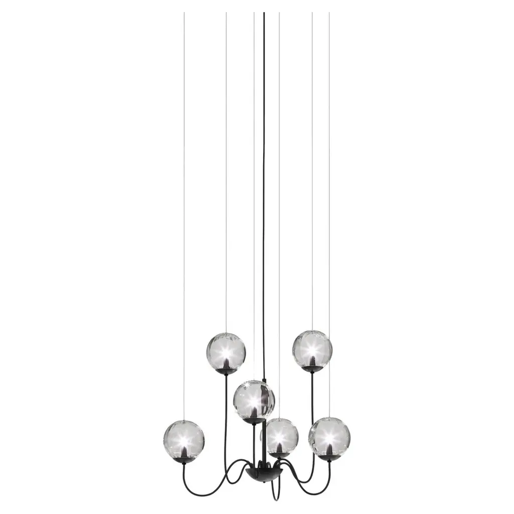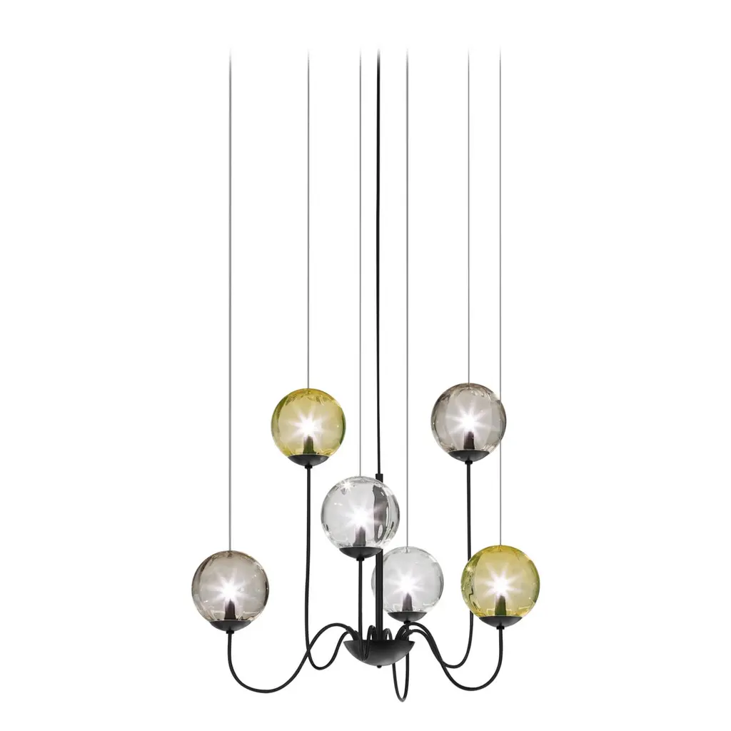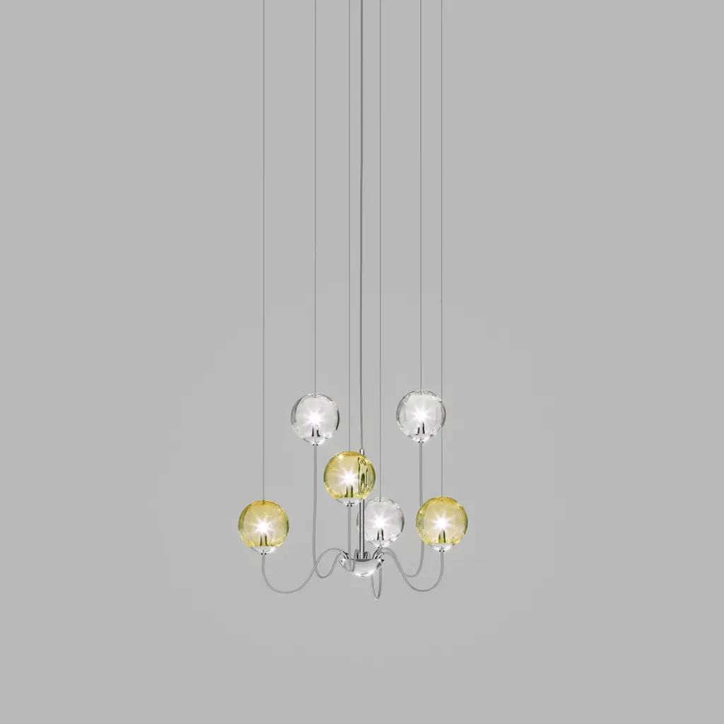 Collection of lamps with a blown and irregular striped glass diffuser. The three sizes of the spheres and the different cable heights are designed to create elegant compositions. The chandelier version allows to fix the diffusers with steel cables to the ceiling, creating different games.Specifications:Material: GlassLight source: G9 ULNo of bulbs: 6×60W G9 UL (120V/60HZ)Dimmer: DIM 1Year: 2015Glass finish: Multicolor 2Frame finish: Glossy ChromeDimensions: Ø 80 x 80 H cmCable length: 150 cmAvailable in other glass finish options: White Shaded, Amber Transparent, Crystal Transparent, Smoky Transparent, Multicolor 1, Multicolor 3Available in other frame finish option: Matt black 1Please inquire about customization options.