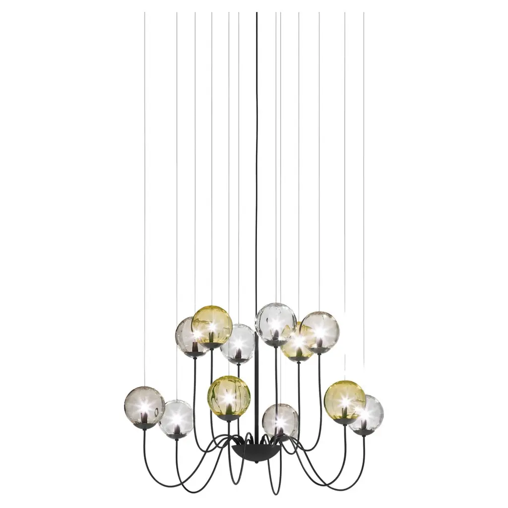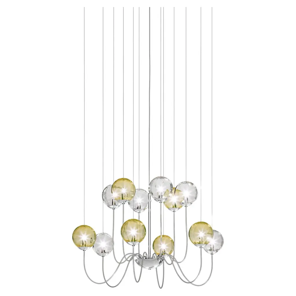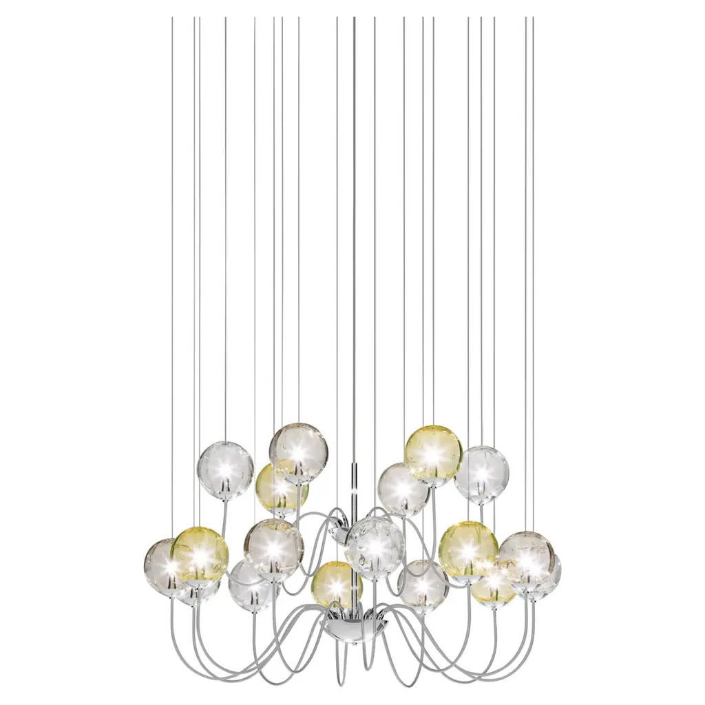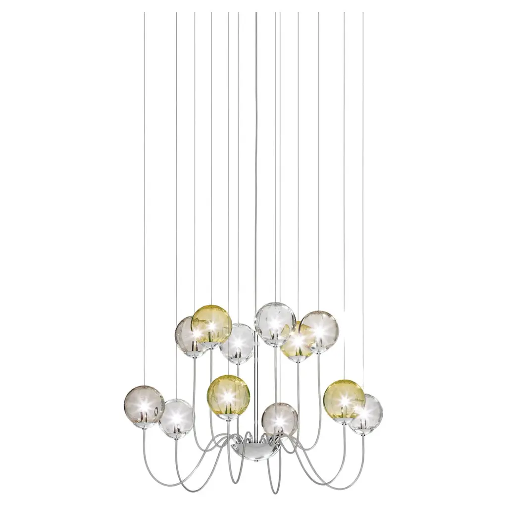 Collection of lamps with a blown and irregular striped glass diffuser. The three sizes of the spheres and the different cable heights are designed to create elegant compositions. The chandelier version allows to fix the diffusers with steel cables to the ceiling, creating different games.Specifications:Material: GlassLight source: G9 ULNo of bulbs: 6×60W G9 UL (120V/60HZ)Dimmer: DIM 1Year: 2015Glass finish: Multicolor 2Frame finish: Glossy ChromeDimensions: Ø 80 x 80 H cmCable length: 150 cmAvailable in other glass finish options: White Shaded, Amber Transparent, Crystal Transparent, Smoky Transparent, Multicolor 1, Multicolor 3Available in other frame finish option: Matt black 1Please inquire about customization options.