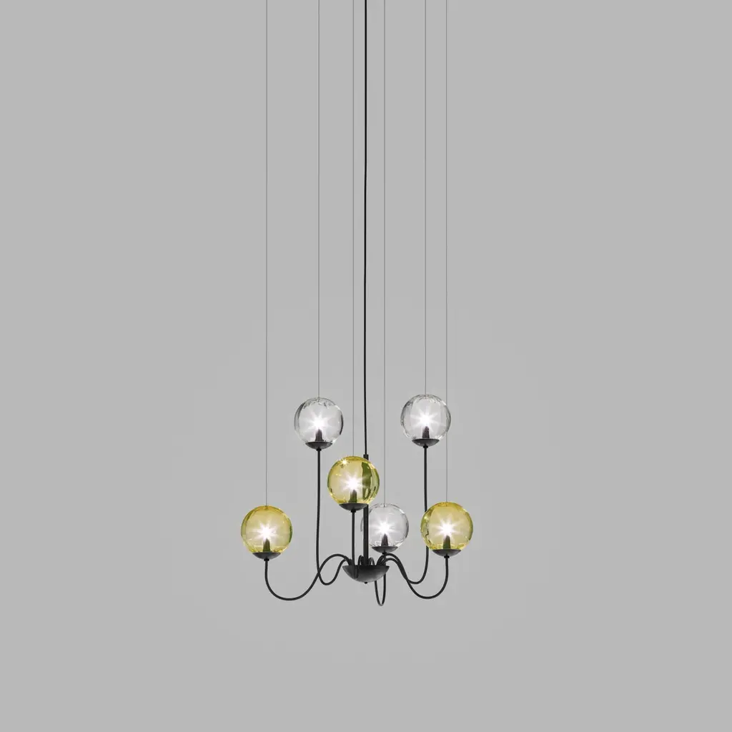 Collection of lamps with a blown and irregular striped glass diffuser. The three sizes of the spheres and the different cable heights are designed to create elegant compositions. The chandelier version allows to fix the diffusers with steel cables to the ceiling, creating different games.Specifications:Material: GlassLight source: G9 ULNo of bulbs: 6×60W G9 UL (120V/60HZ)Dimmer: DIM 1Year: 2015Glass finish: Multicolor 2Frame finish: Matt Black 1Dimensions: Ø 80 x 80 H cmCable length: 150 cmAvailable in other glass finish options: White Shaded, Amber Transparent, Crystal Transparent, Smoky Transparent, Multicolor 1, Multicolor 3Available in other frame finish option: Glossy ChromePlease inquire about customization options.