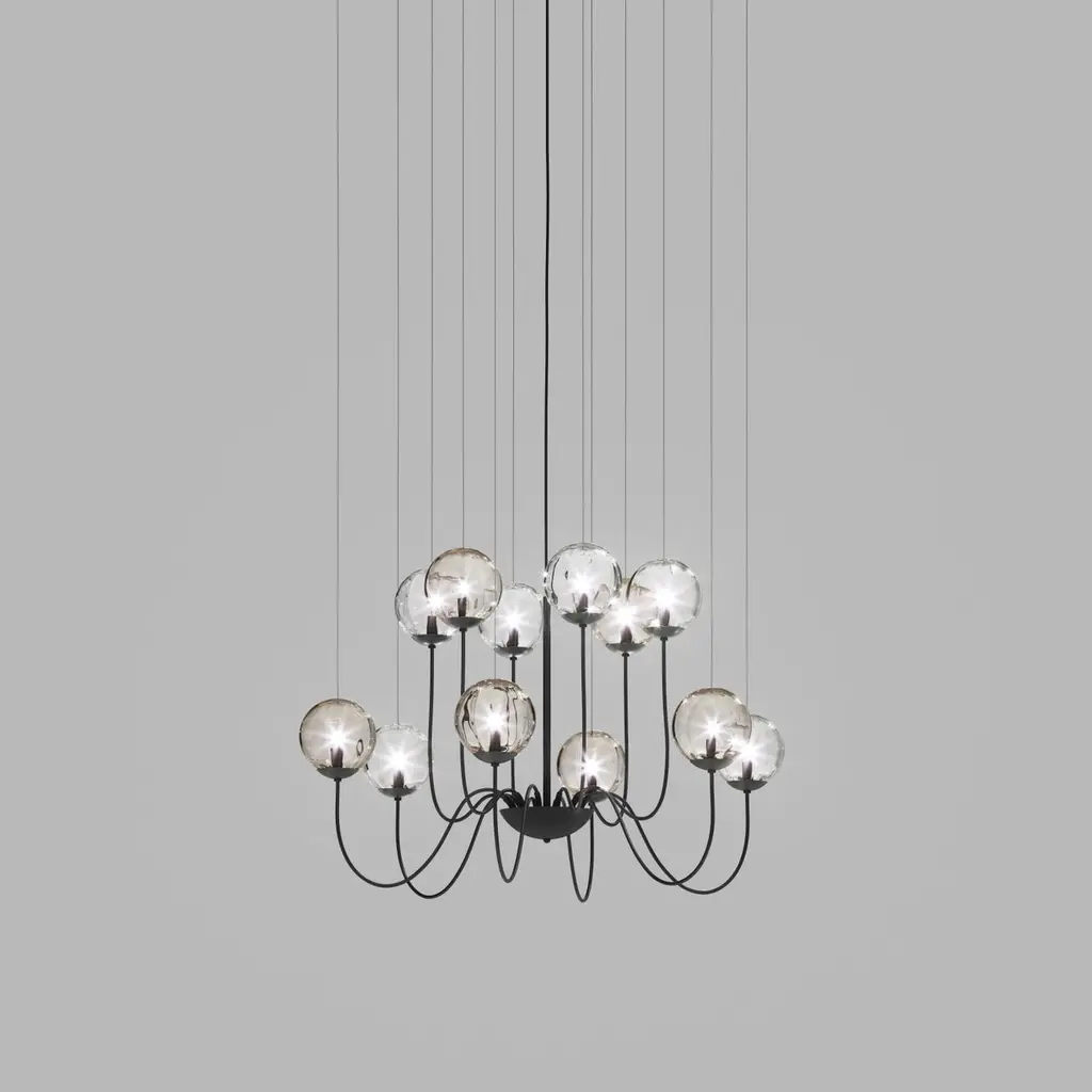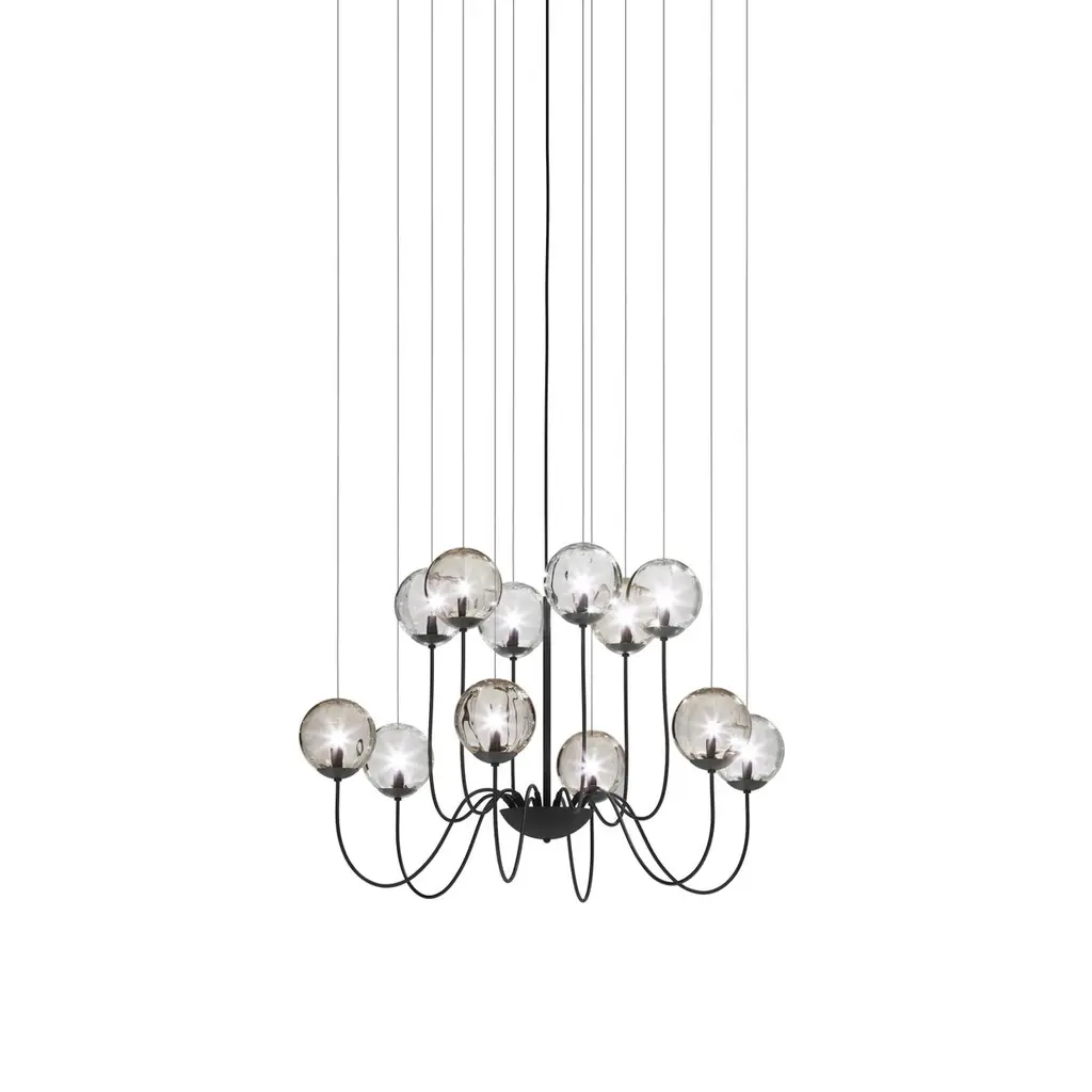 Collection of lamps with a blown and irregular striped glass diffuser. The three sizes of the spheres and the different cable heights are designed to create elegant compositions. The chandelier version allows to fix the diffusers with steel cables to the ceiling, creating different games.Specifications:Material: GlassLight source: G9 ULNo of bulbs: 12×60W G9 UL (120V/60HZ)Dimmer: DIM 1Year: 2015Glass finish: Multicolor 3Frame finish: Matt Black 1Dimensions: Ø 130 x 100 H cmCable length: 230 cmAvailable in other glass finish options: White Shaded, Amber Transparent, Crystal Transparent, Smoky Transparent, Multicolor 1, Multicolor 2Available in other frame finish option: Glossy ChromePlease inquire about customization options.