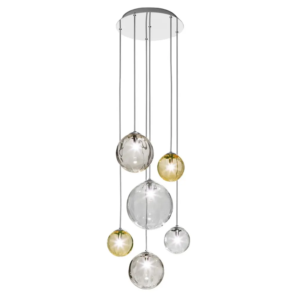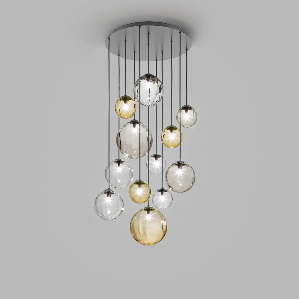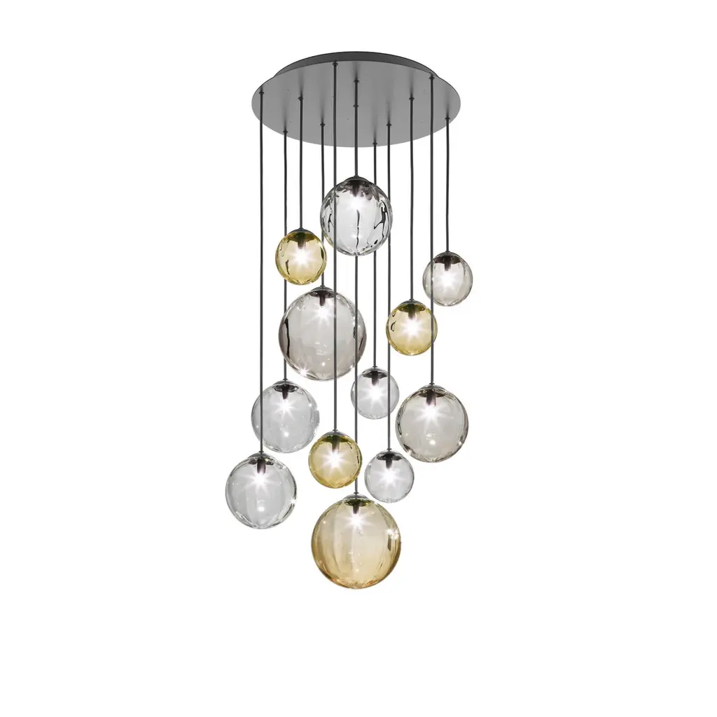 Collection of lamps with a blown and irregular striped glass diffuser. The three sizes of the spheres and the different cable heights are designed to create elegant compositions. The chandelier version allows to fix the diffusers with steel cables to the ceiling, creating different games.Specifications:Material: GlassLight source: G9 ULNo of bulbs: 12x60W G9 UL (120V/60HZ)Dimmer: DIM 1Year: 2015Glass finish: Multicolor 1Frame finish: Matt Black 1Dimensions: Ø 83 x 120 H cmCable length: 80 cmAvailable in other glass finish options: Amber Transparent, White Shaded, Crystal Transparent, Smoky Transparent, Multicolor 2, Multicolor 3Available in other frame finish option: Glossy Chrome Available in other size options: Ø 16, Ø 28, Ø 22, 91x35, 136x38, Ø 58, Ø 108, Ø 50Please inquire about customization options.