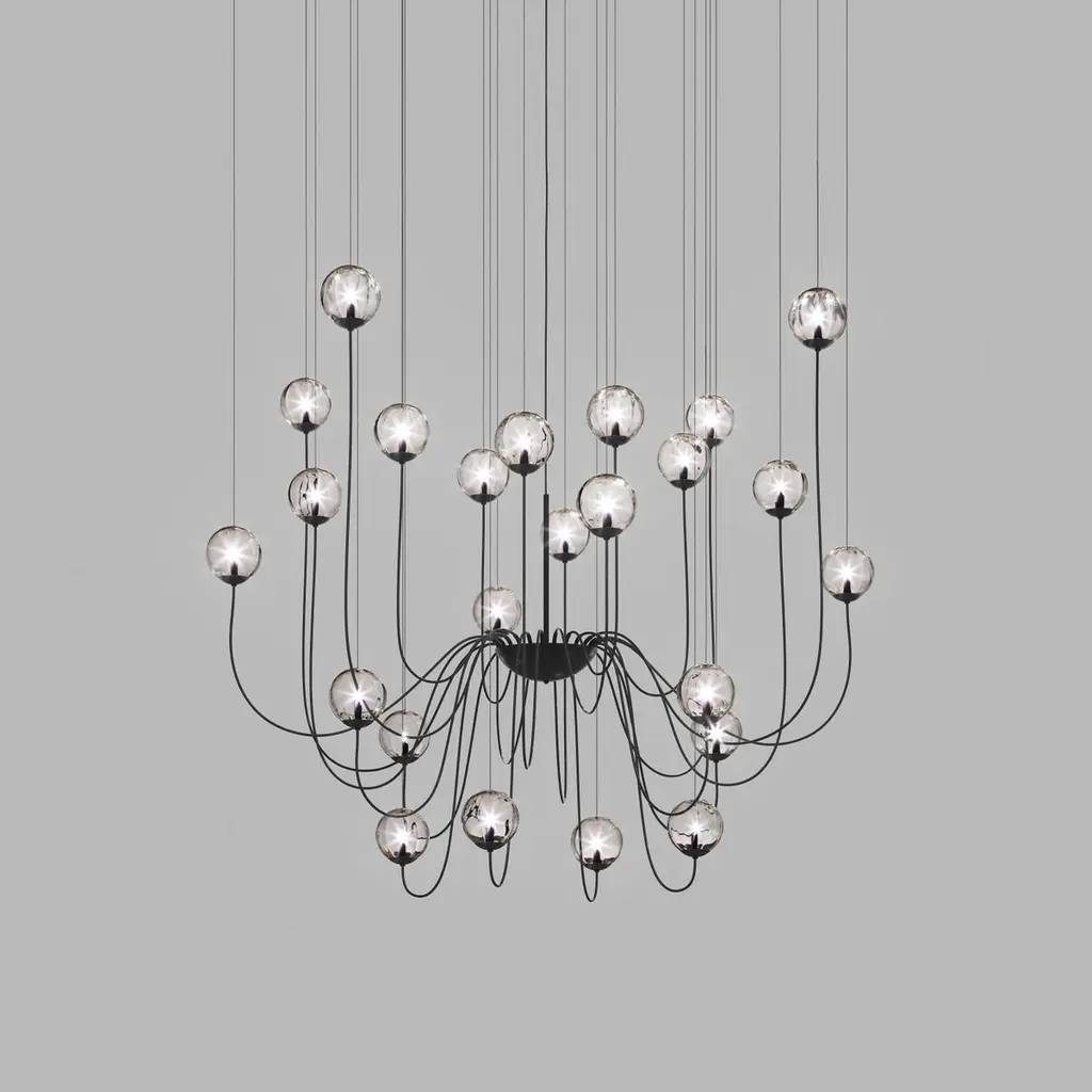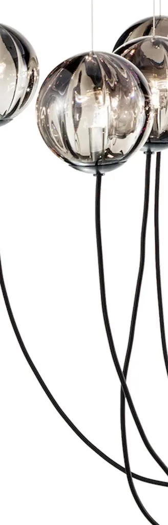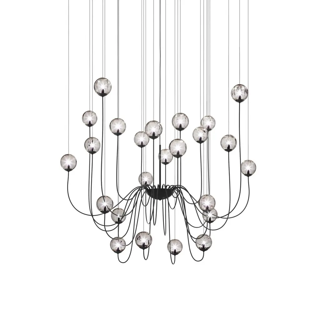 Collection of lamps with blown glass diffuser with an original irregularly lined ‘dégradé’ finish. The arms of the chandelier are hung individually to customer demand.Light source: 24 x 25W G9.