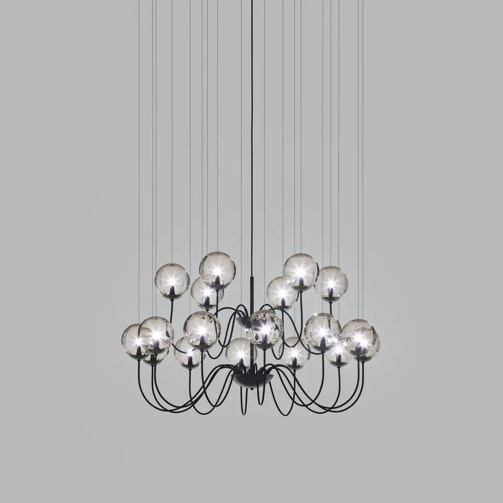 Collection of lamps with a blown and irregular striped glass diffuser. The three sizes of the spheres and the different cable heights are designed to create elegant compositions. The chandelier version allows to fix the diffusers with steel cables to the ceiling, creating different games.Specifications:Material: GlassLight source: G9 ULNo of bulbs: 18×40W G9 UL (120V/60HZ)Dimmer: DIM 1Year: 2015Glass finish: Smoky TransparentFrame finish: Matt Black 1Dimensions: Ø 130 x 130 H cmCable length: 200 cmAvailable in other glass finish options: White Shaded, Amber Transparent, Crystal Transparent, Multicolor 1, Multicolor 2, Multicolor 3Available in other frame finish option: Glossy ChromePlease inquire about customization options.