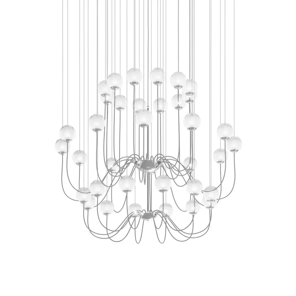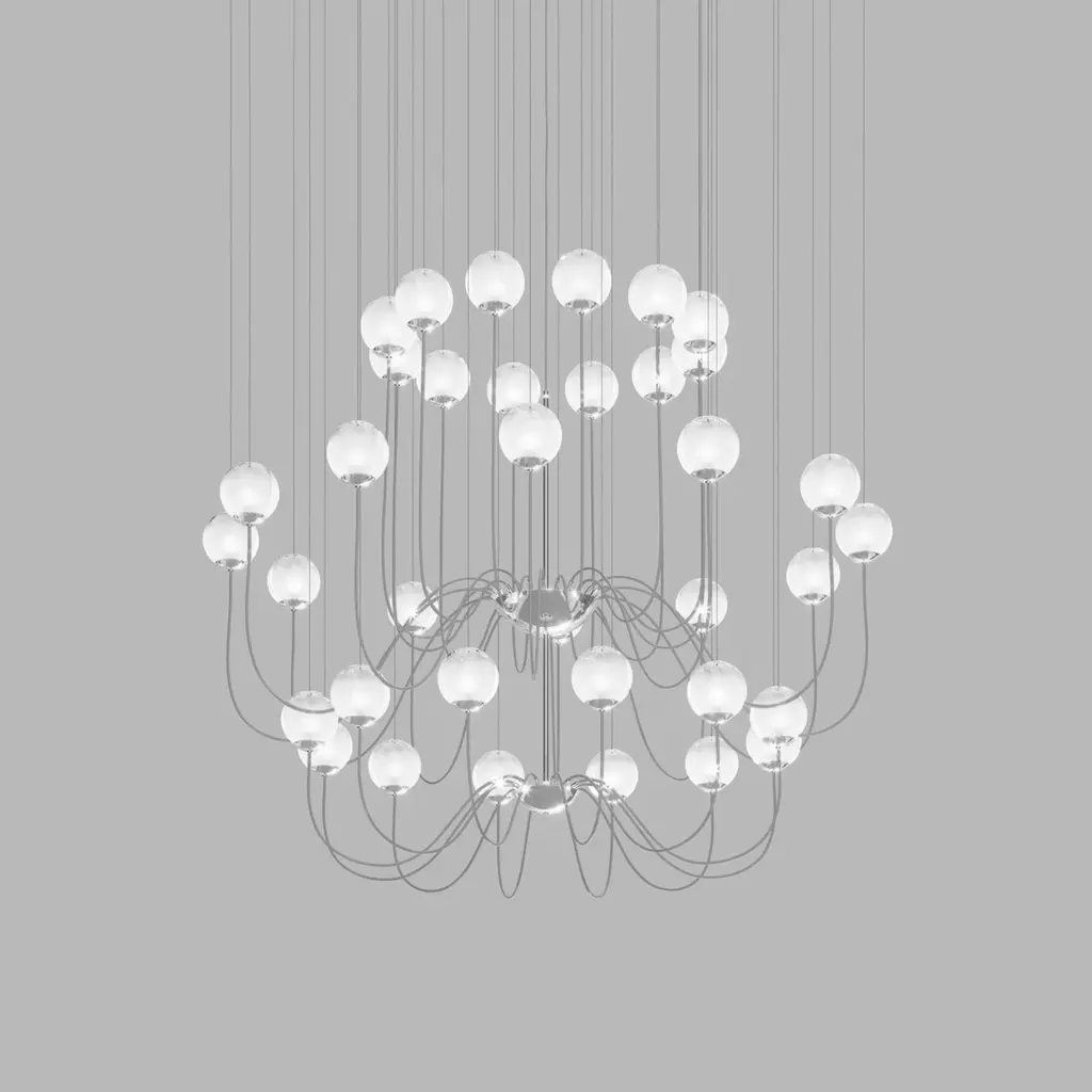 Collection of lamps with a blown and irregular striped glass diffuser. The three sizes of the spheres and the different cable heights are designed to create elegant compositions. The chandelier version allows to fix the diffusers with steel cables to the ceiling, creating different games.Specifications:Material: GlassLight source: G9 ULNo of bulbs: 36×20W G9 UL (120V/60HZ)Dimmer: DIM 1Year: 2015Glass finish: White ShadedFrame finish: Glossy ChromeDimensions: Ø 190 x 180 H cmCable length: 160 cmAvailable in other glass finish options: Amber Transparent, Crystal Transparent, Smoky Transparent, Multicolor 1, Multicolor 2, Multicolor 3Available in other frame finish option: Matt black 1Please inquire about customization options.