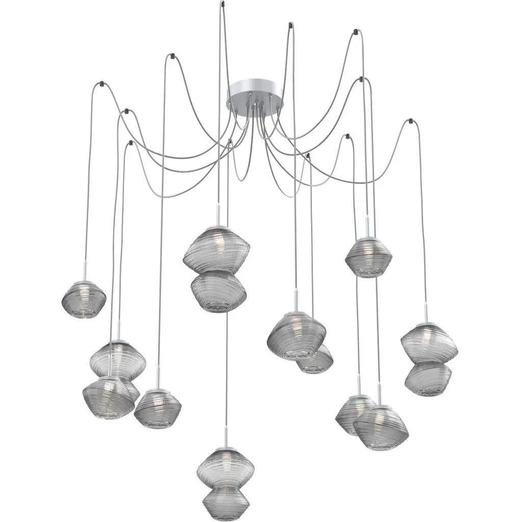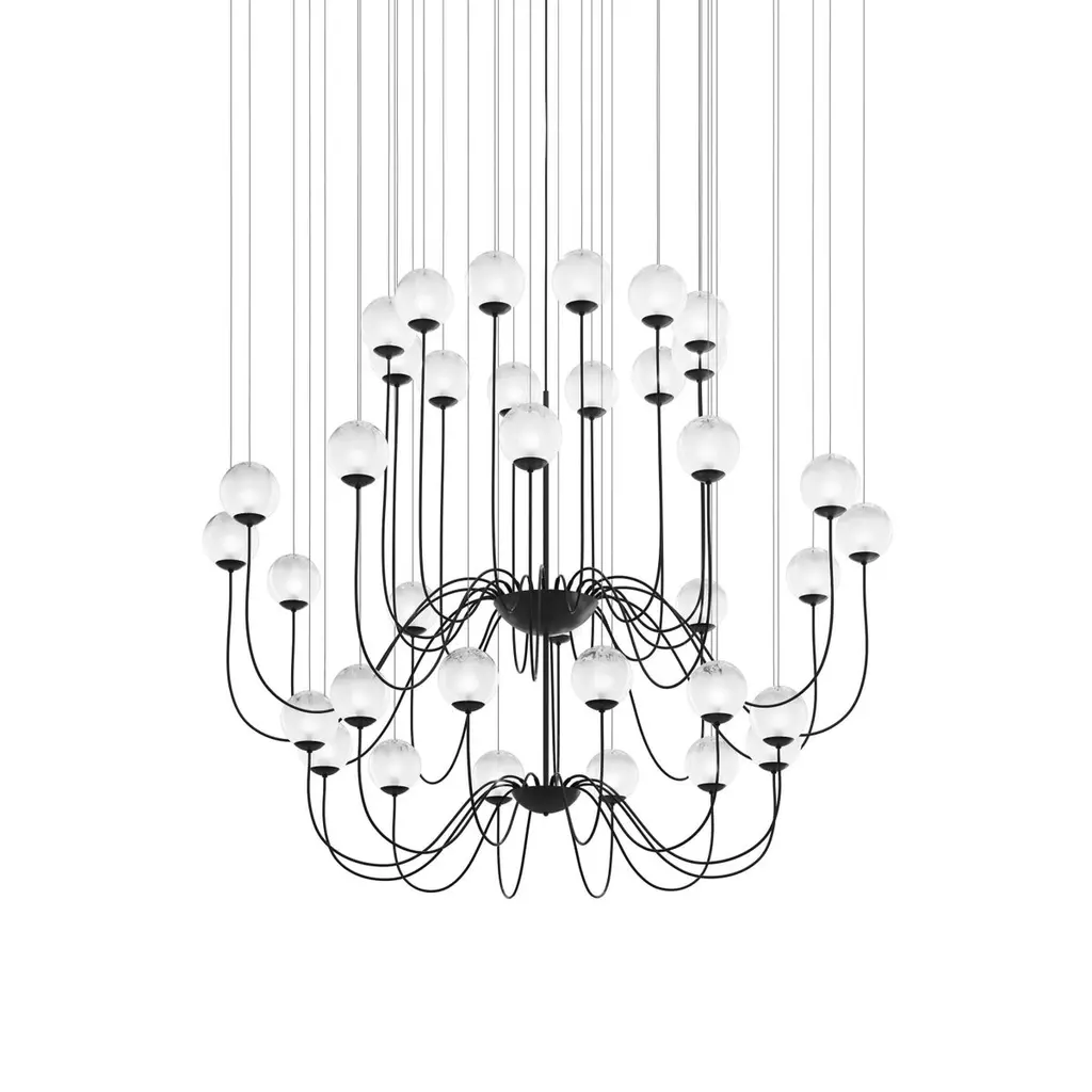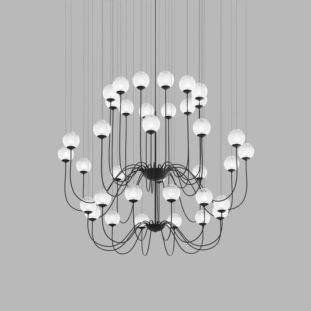 Collection of lamps with a blown and irregular striped glass diffuser. The three sizes of the spheres and the different cable heights are designed to create elegant compositions. The chandelier version allows to fix the diffusers with steel cables to the ceiling, creating different games.Specifications:Material: GlassLight source: G9 ULNo of bulbs: 36×20W G9 UL (120V/60HZ)Dimmer: DIM 1Year: 2015Glass finish: White ShadedFrame finish: Matt black 1Dimensions: Ø 190 x 180 H cmCable length: 160 cmAvailable in other glass finish options: Amber Transparent, Crystal Transparent, Smoky Transparent, Multicolor 1, Multicolor 2, Multicolor 3Available in other frame finish option: Glossy ChromePlease inquire about customization options.