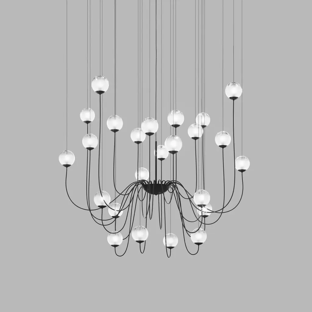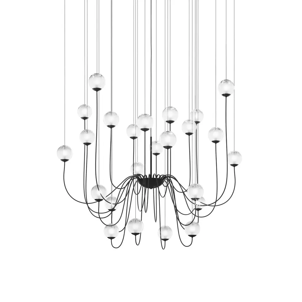 Collection of lamps with a blown and irregular striped glass diffuser. The three sizes of the spheres and the different cable heights are designed to create elegant compositions. The chandelier version allows to fix the diffusers with steel cables to the ceiling, creating different games.Specifications:Material: GlassLight source: G9 ULNo of bulbs: 24×25W G9 UL (120V/60HZ)Dimmer: DIM 1Year: 2015Glass finish: White ShadedFrame finish: Matt Black 1Dimensions: Ø 190 x 160 H cmCable length: 180 cmAvailable in other glass finish options: Amber Transparent, Crystal Transparent, Smoky Transparent, Multicolor 1, Multicolor 2, Multicolor 3Available in other frame finish option: Glossy ChromePlease inquire about customization options.