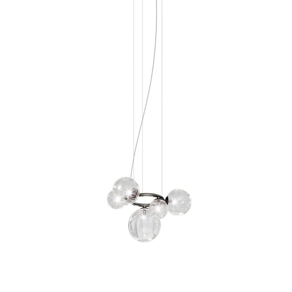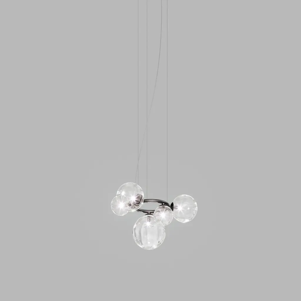 The distinctive feature of this model from the Puppet Ring collection are the rings with increasing diameter. They can be combined in different sequences to form the framework on which the precious glass spheres in three different sizes are placed, blending with the structure thanks to a preformation inside the blown glass. Aesthetically light and elegant, Puppet Ring ethereally combines crystal, smoky, amber and shaded white glass with gold and black matt nickel finishes.Specifications:Material: GlassLight source: G9 ULNo of bulbs: 5x60W G9 UL (120V/60HZ)Dimmer: DIM 1Year: 2019Glass finish: Crystal TransparentFrame finish: Matt Black NickelDimensions: 72 W x 57 D x 43 H cmCable length: 200 cmAvailable in other glass finish options: Amber Transparent, White Shaded, Smoky TransparentAvailable in other frame finish option: Matt gold 3Please inquire about customization options.
