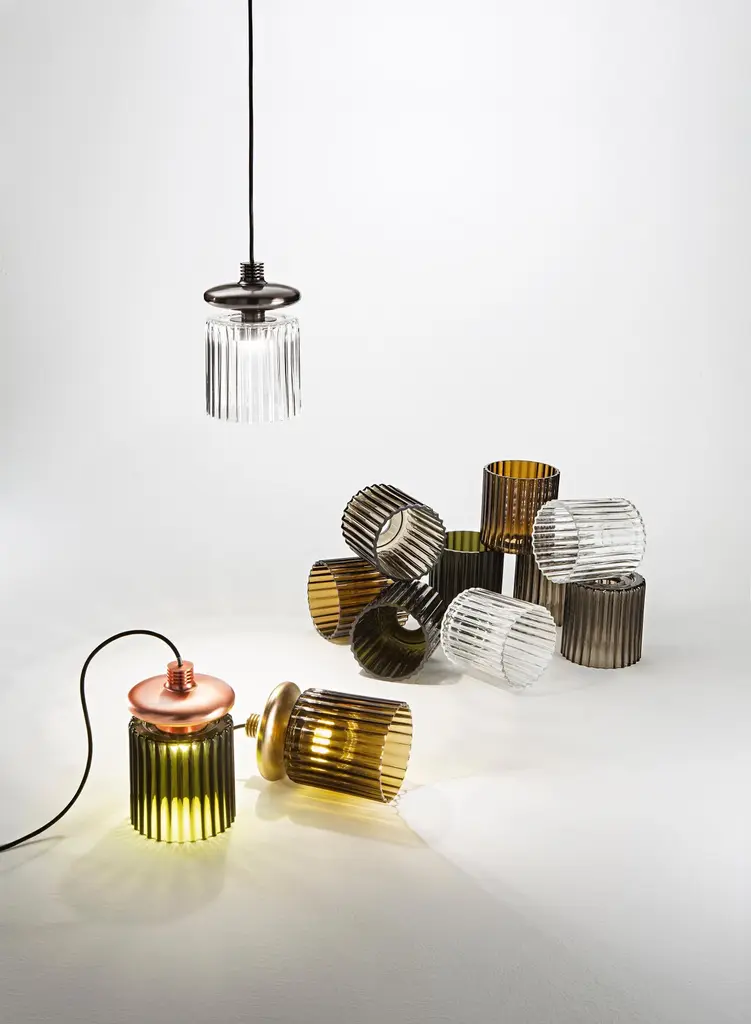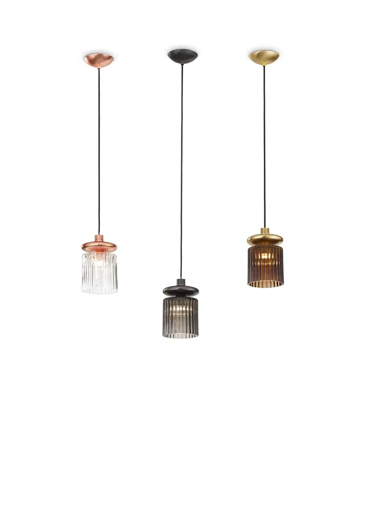 The “technicity” of the metal element combined with the blown glass diffuser gives Tread an “industrial” style. An object reminiscent of vintage electrical equipment for its particular shape, in which the finned heat sink, combined with blown glass, becomes a distinctive element. Tread creates an avant-garde and stylish atmosphere by combining crystal, smoky, burned earth and transparent old green glass with copper, gold and bronze matt finishes.Specifications:Material: GlassLight source: LED L2213 ULNo of bulbs: 1x8W LED L2213 UL (100-120 v 50/60HZ)Lumens: 1500 lmKelvin: 2700 KDimmer: DIM 2Year: 2019Glass finish: Burned Earth TransparentFrame finish: Matt Copper 1Dimensions: Ø 15 x 22 H cmCable length: 200 cmAvailable in other glass finish options: Crystal Transparent, Smoky Transparent, Old Green TransparentAvailable in other frame finish options: Matt Bronze 3, Matt Gold 3Available in other light source options: LED L2313 UL - $ 840, LED L3213 UL - $ 840, LED L3313 UL - $ 840Available in other lumens option: 1600 lm for LED L3213 UL, LED L3313 ULAvailable in other kelvin option: 3000 K for LED L3213 UL, LED L3313 ULAvailable in other dimmer option: DIM 3 for LED L2313 UL, LED L3313 ULPlease inquire about customization options.