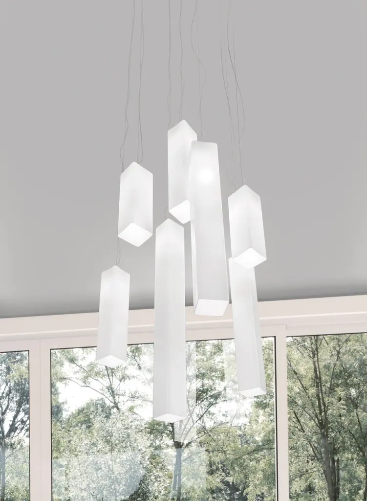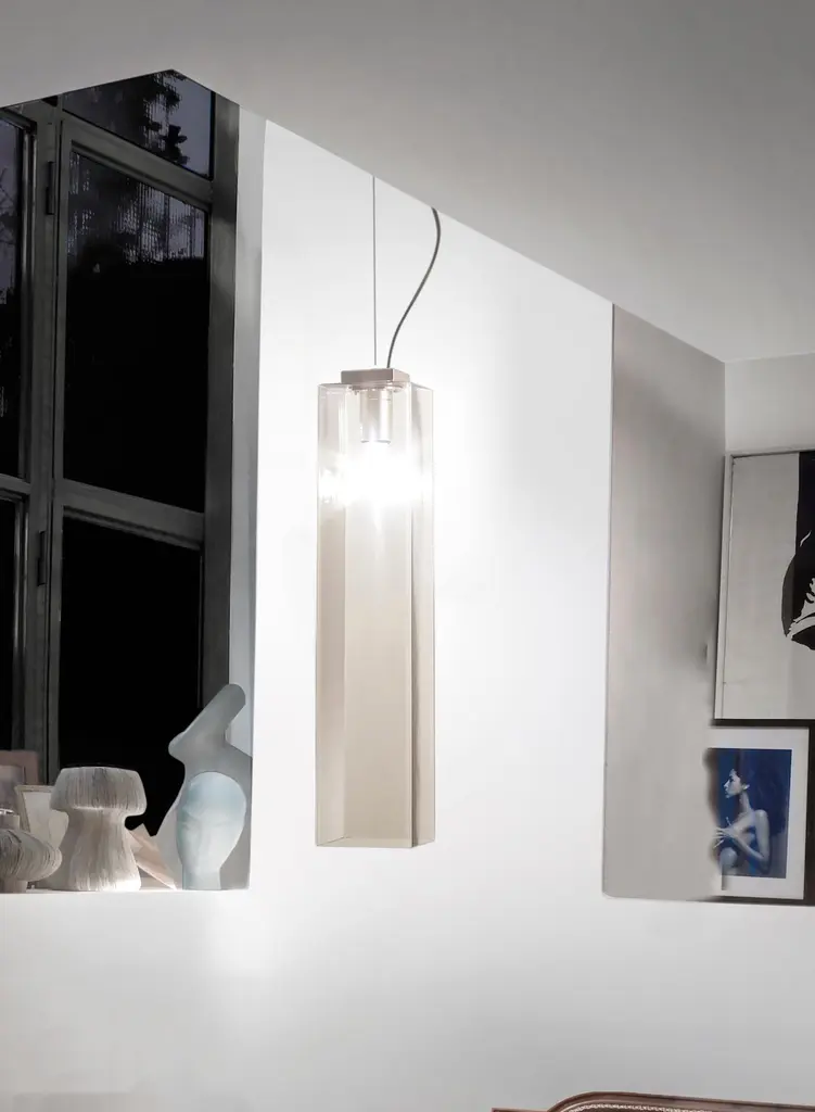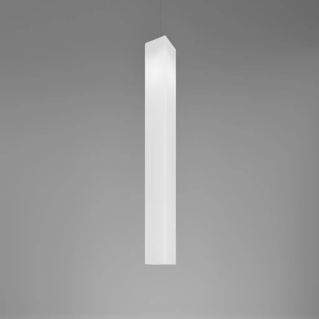 A series of five elements of straight lines in different lenghts, made of mouth-blown glass, which can be used as standalone pendants and ceiling fixtures or in multiple combinations.Specifications:Material: GlassLight source: E26 ULNo of bulbs: 1x60W E26 UL (120V/60HZ)Dimmer: DIM 1Year: 2005Glass finish: White GlossyFrame finish: Matt NickelDimensions: 13 W x 120 H cmCable length: 200 cmAvailable in other glass finish option: Smoky TransparentAvailable in other size options: 13x20, 13x40, 13x60, 13x90 cmPlease inquire about customization options.