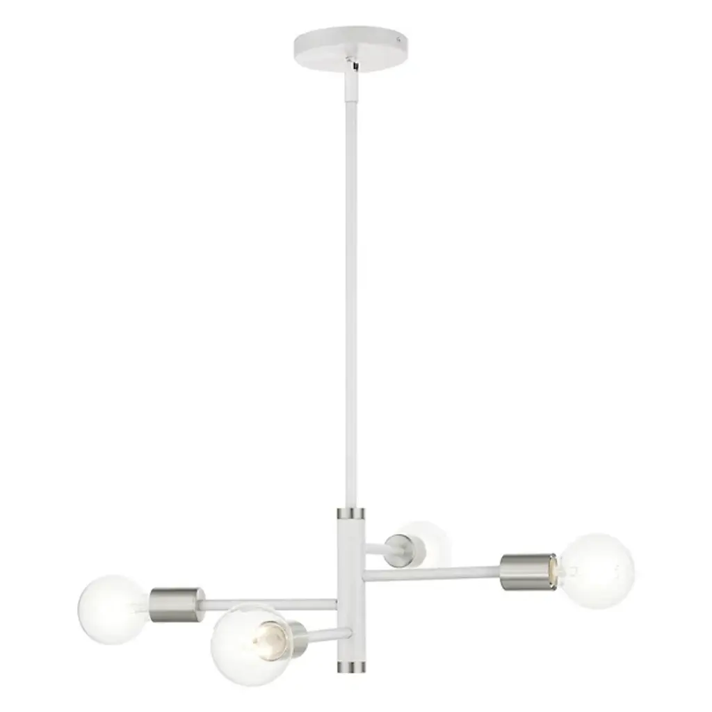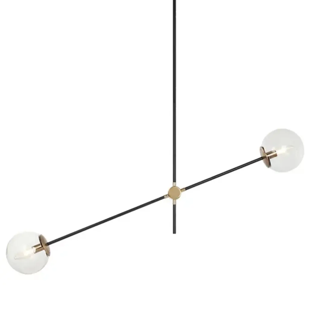 The Vitale Linear Pendant Light by Huxe is a modern and dynamic fixture that instantly brings elegance to a space. This simple piece consists of a circular canopy that drops a single, slender downrod. At its end, a joint supports a similar, traversing beam that can be adjusted to change its angle. Clear glass globes are held at each end of the beam and contain the fixture’s incandescent lamping, casting a warm ambient glow over its surroundings, while contrasting metal accenting lends the piece a retro flair.