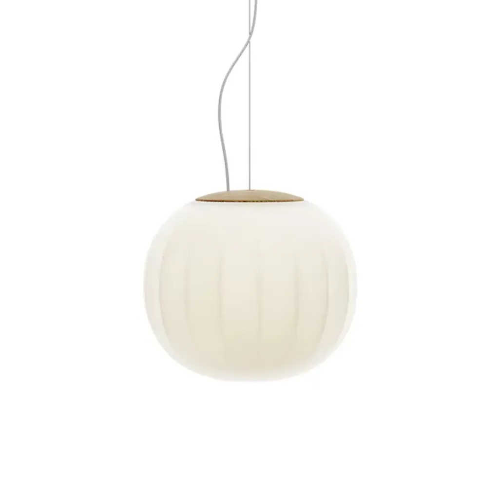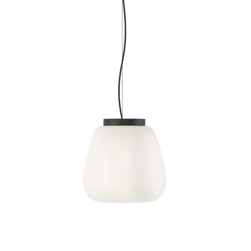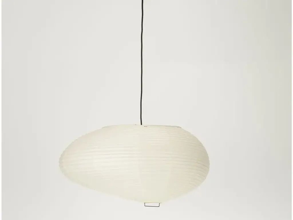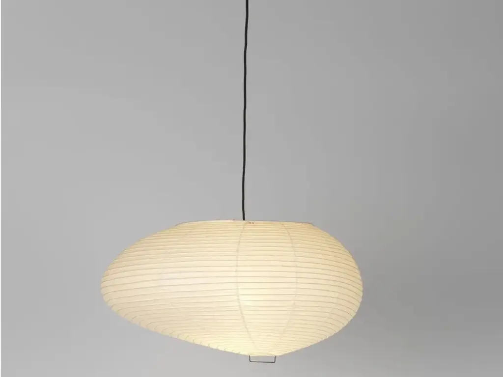 Akari is a suspension lamp with Japanese paper lampshade.The Akari Light Sculptures (1951) by Isamu Noguchi are a series of luminaires, handcrafted from traditional washi paper by Japanese artisans.The oeuvre of Japanese-American artist and designer Isamu Noguchi (1904–1988) is unusually multi-faceted. In addition to sculptures, he also created stage sets, furniture, lighting and interiors, as well as outdoor plazas and gardens. As a sculptor, his interest was not restricted to materials and form, but also extended to spatial effects and interior designs. Noguchi intended his art to serve both practical and social functions, and his sculptural style exerted a lasting influence on the idiom of organic design in the 1950s.In 1951 Isamu Noguchi began to design the Akari Light Sculptures, works characterised by weightless luminosity. He chose the name 'akari' for these objects, a word that means 'light' in Japanese, connoting both illumination and physical lightness. During a journey to Japan, Noguchi paid a visit to Gifu, a town known for its manufacture of paper parasols and lanterns. While there he sketched his first two Akari Light Sculptures, and over the following years he created a total of more than 100 models, consisting of table, floor and ceiling lamps ranging in size from 24 to 290 cm.Each luminaire is meticulously crafted by hand in the Ozeki workshop, a traditional family-run company based in Gifu. In a first step, bamboo rods are stretched across the original wooden forms designed by Noguchi to make the framework that determines the object's shape. Washi paper, derived from the bark of the mulberry tree, is cut in strips to fit the size and shape of the lamp and then glued to the bamboo ribbing. After the glue has dried, the wooden form is removed and the shade can be folded. The Akari Light Sculptures are packed for shipping or storage in flat boxes developed especially for the luminaires.'The harshness of electricity is thus transformed through the magic of paper back to the light of our origin – the sun – so that its warmth may continue to fill our rooms at night.'Isamu NoguchiThe Akari Light Sculptures are marked with a stylised sun-and-moon logo, which also resembles the corresponding Japanese characters. This symbol guarantees the authenticity of each product.