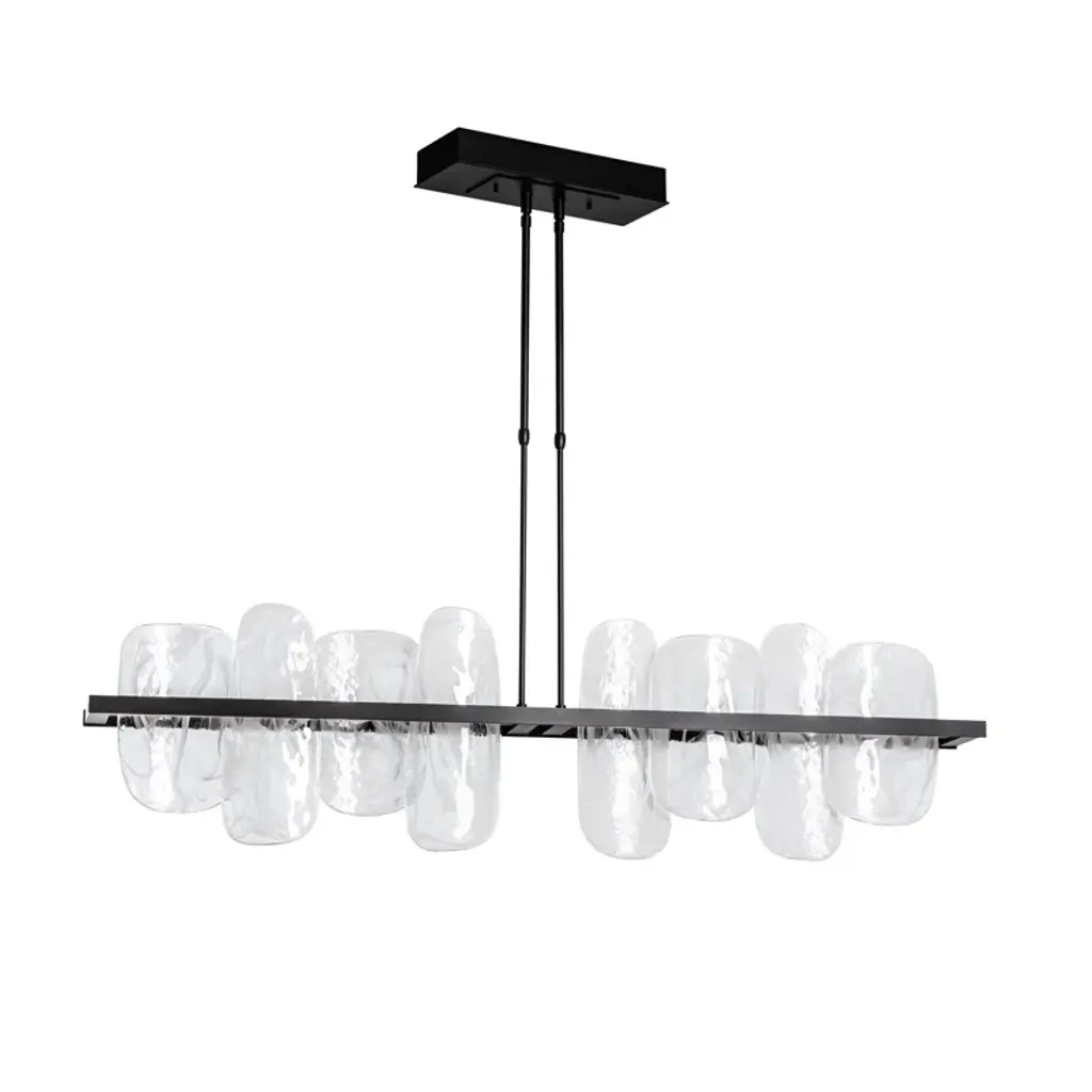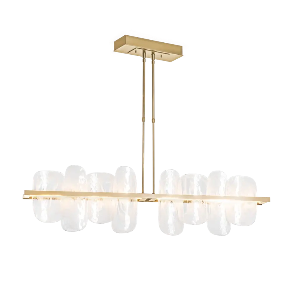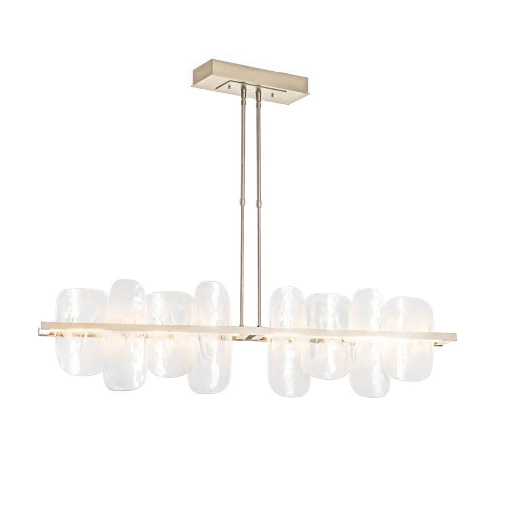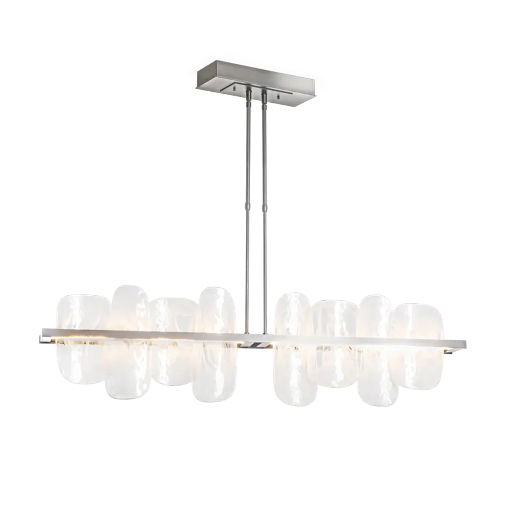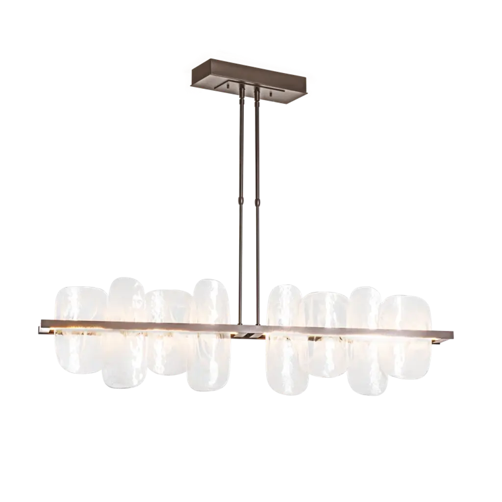 Exquisite, thick, handmade glass features abstract white "swirls" that command attention. The Vitre large linear LED Pendant is perfect over a dining table, a large island, or even a billiards table. Bright and beautiful, this double-rod lighting fixture's LED light-guide platform creates an up-and-down wash of light, illuminating the stunning glass elements and its environs. All Hubbardton Forge products are hand-crafted to last one at a time in Vermont.