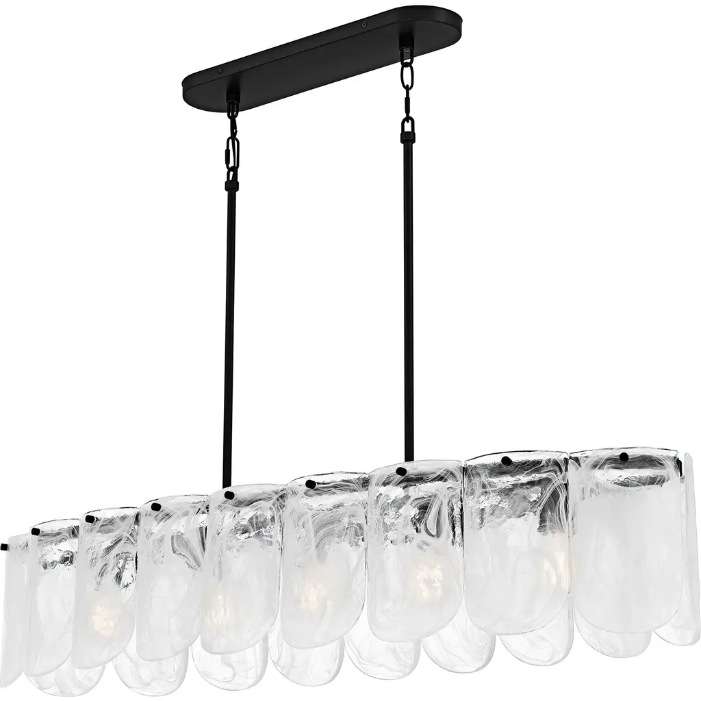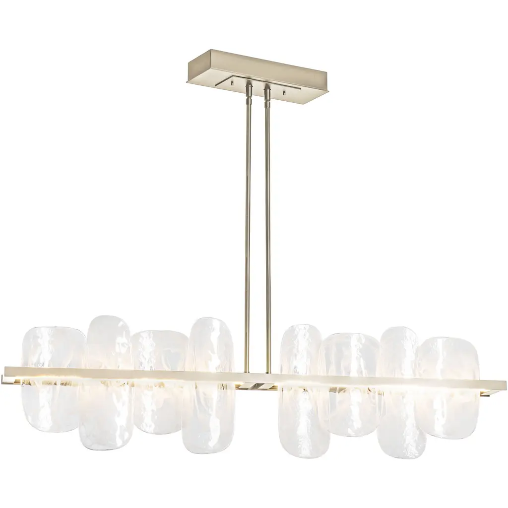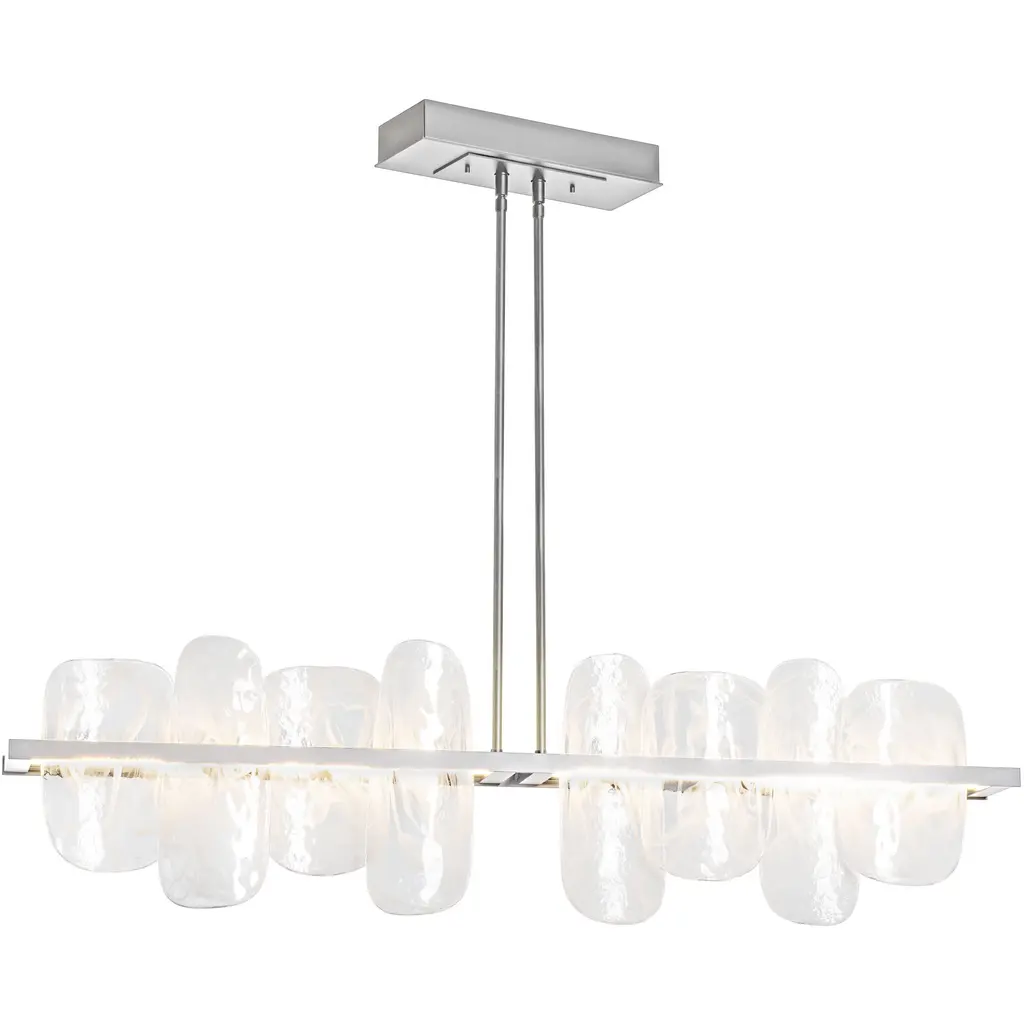 Exquisite, thick, handmade glass features abstract white "swirls" that command attention. The Vitre Large Linear LED Pendant is perfect over a dining table, large island, or even a billiards table. Bright and beautiful, this double-rod lighting fixture's LED light-guide platform creates an up-and-down wash of light, illuminating the stunning glass elements and its environs.