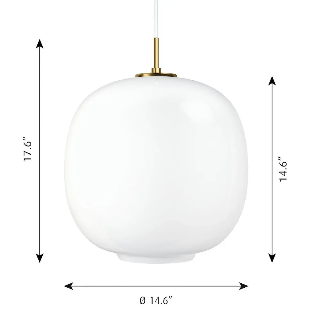 In 2016 the Radiohus Pendant made a comeback under the name of VL45 Radiohus Pendant. It was originally designed in the 1940s by Danish architect Vilhelm Lauritzen in partnership with Louis Poulsen for the construction of the Radiohuset building (the Danish broadcasting house) in Copenhagen. The pendant features the original design, with a brass suspension as well as a shade of three layers of handblown glass. The innermost and outermost layers are made of transparent polished glass, while white glass is used for the intermediate layer. In 2019, the two existing sizes were complemented with a smaller size, to open up the possibilities for an even wider variety of usage and arrangements.