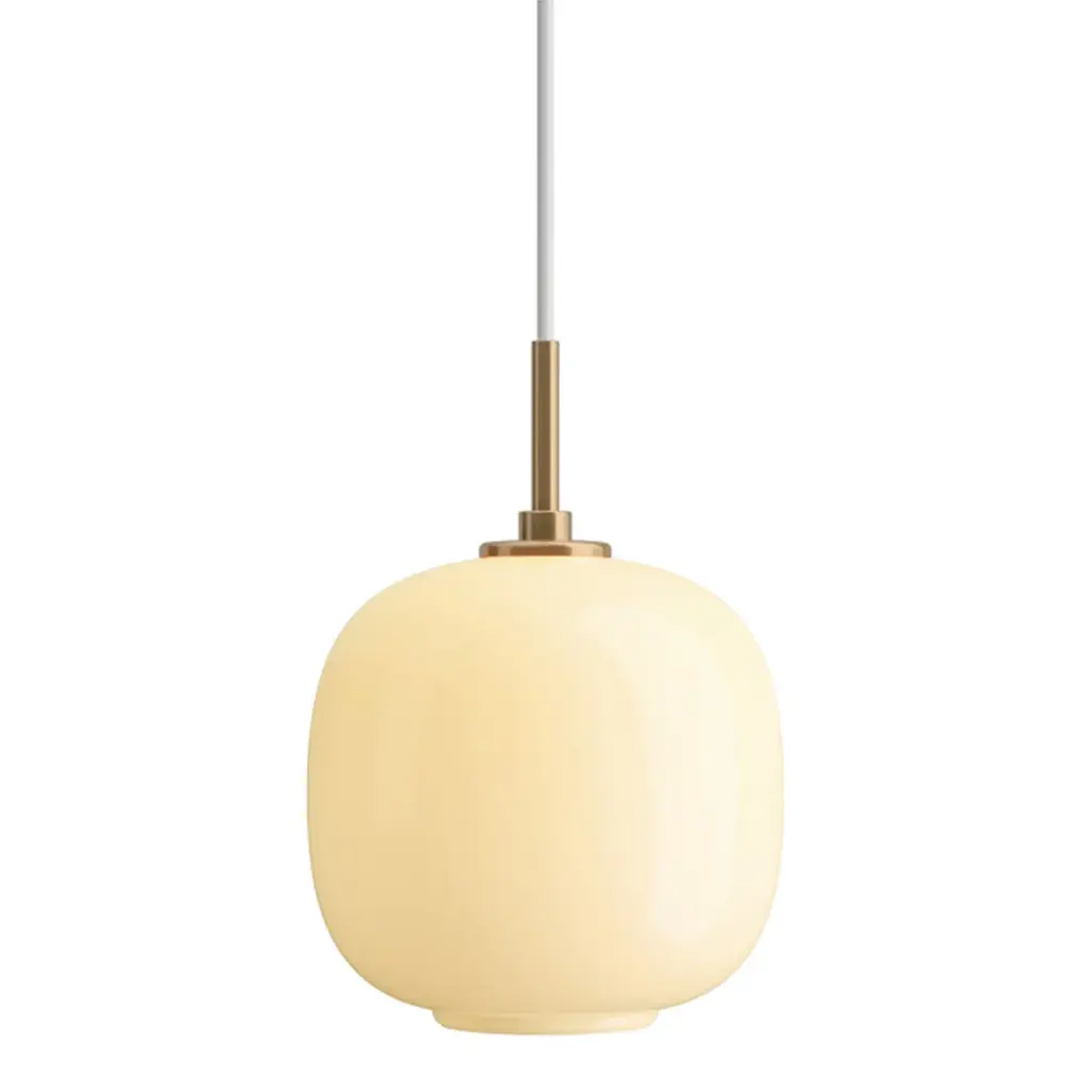 In 2016 the Radiohus Pendant made a comeback under the name of VL45 Radiohus Pendant. It was originally designed in the 1940s by Danish architect Vilhelm Lauritzen in partnership with Louis Poulsen for the construction of the Radiohuset building (the Danish broadcasting house) in Copenhagen. The pendant features the original design, with a brass suspension as well as a shade of three layers of handblown glass. The innermost and outermost layers are made of transparent polished glass, while white glass is used for the intermediate layer. In 2019, the two existing sizes were complemented with a smaller size, to open up the possibilities for an even wider variety of usage and arrangements.