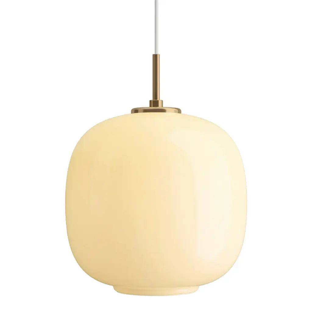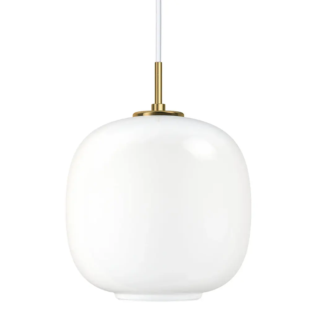 In 2016 the Radiohus Pendant made a comeback under the name of VL45 Radiohus Pendant. It was originally designed in the 1940s by Danish architect Vilhelm Lauritzen in partnership with Louis Poulsen for the construction of the Radiohuset building (the Danish broadcasting house) in Copenhagen. The pendant features the original design, with a brass suspension as well as a shade of three layers of handblown glass. The innermost and outermost layers are made of transparent polished glass, while white glass is used for the intermediate layer. In 2019, the two existing sizes were complemented with a smaller size, to open up the possibilities for an even wider variety of usage and arrangements.