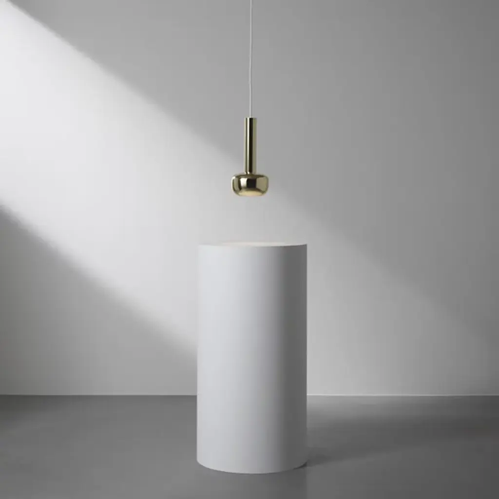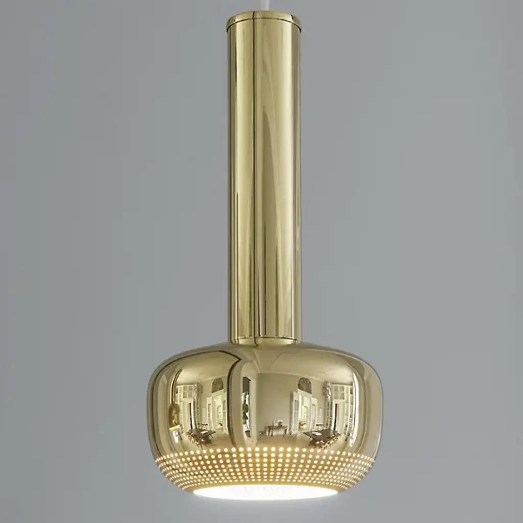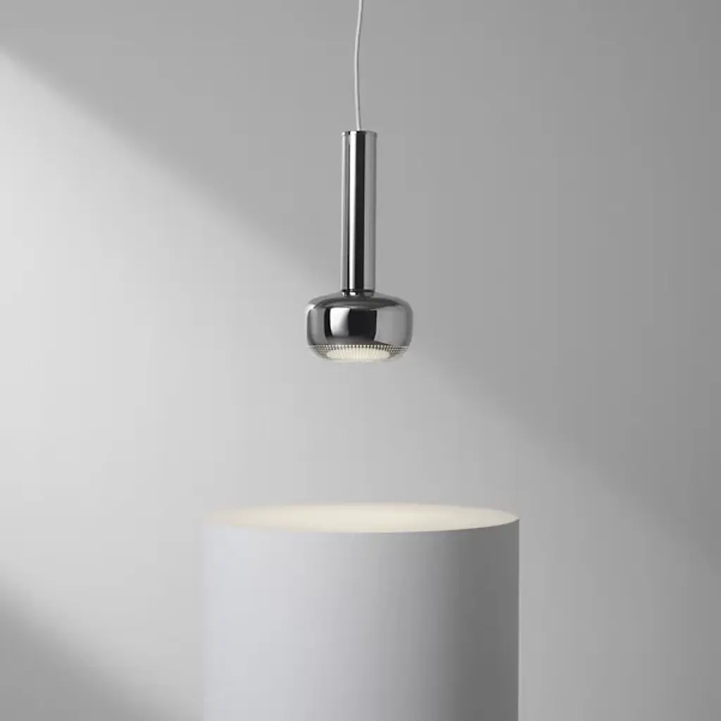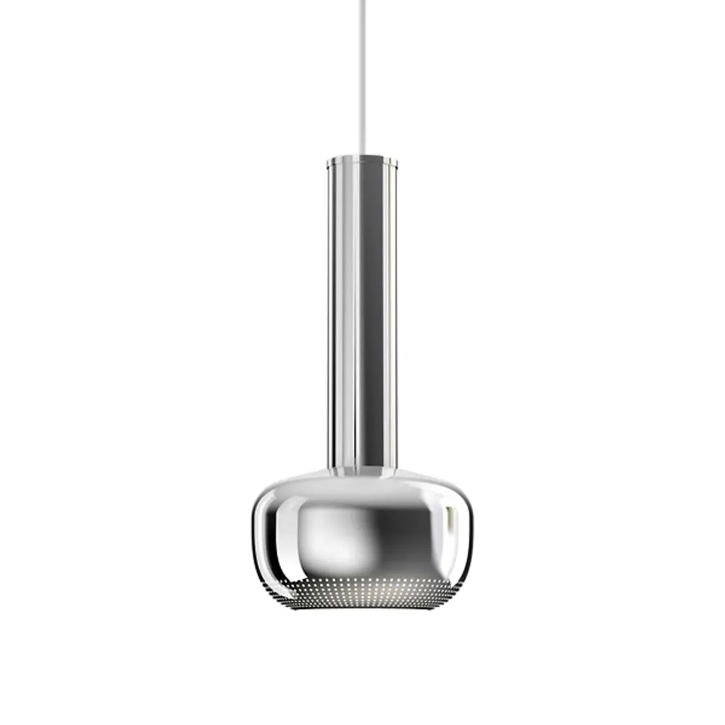 The VL 56 Mini Pendant from Louis Poulsen gives its surroundings an expressive and direct appeal. Designed by Danish functionalist architect Vilhelm Lauritzen, who created every aspect of a building originally conceived for the Danish Labour Movement, which is now a concert hall, with the lamps still shining bright. A slim disc canopy secures the fixture, transmitting a fine stem to a sculptural aluminum structure below, a cylindrical light housing supporting a lower, rounded shade around the lamping, left open at its base and accompanied by a layer of pinhole vents around it to deliver a mix of direct light and soft ambiance below.