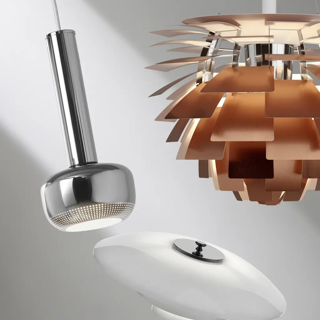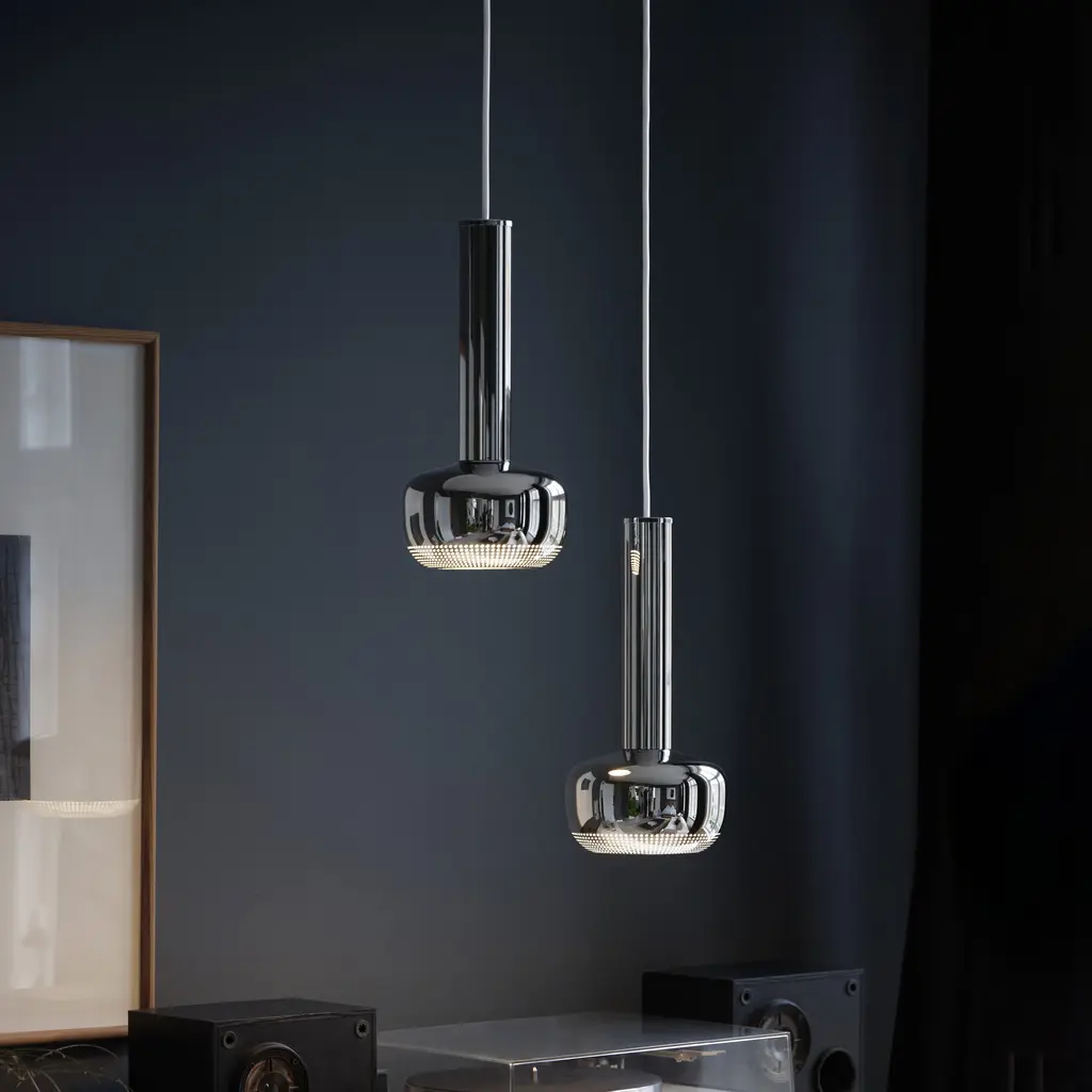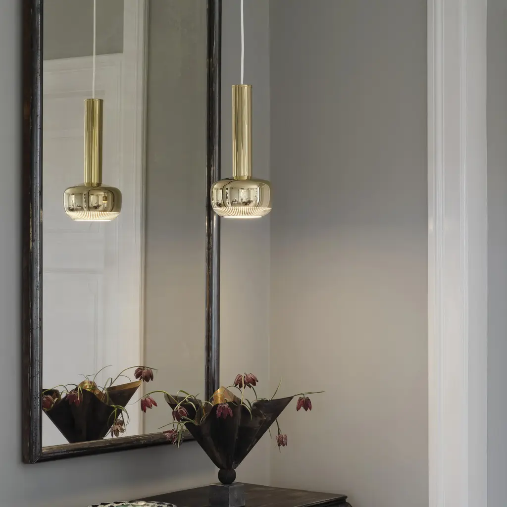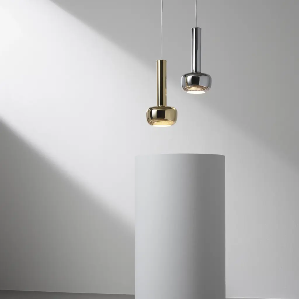 Danish functionalist master Vilhelm Lauritzen designed this fixture for Copenhagen's Vega concert venue in 1956 and to this day it hangs above the wood-paneled bar. VL 56 gleams in either polished brass or high-luster chrome, emitting glare-free downward illumination as the radial perforations at the edge create a soft pattern on both the shade and surrounding surfaces.