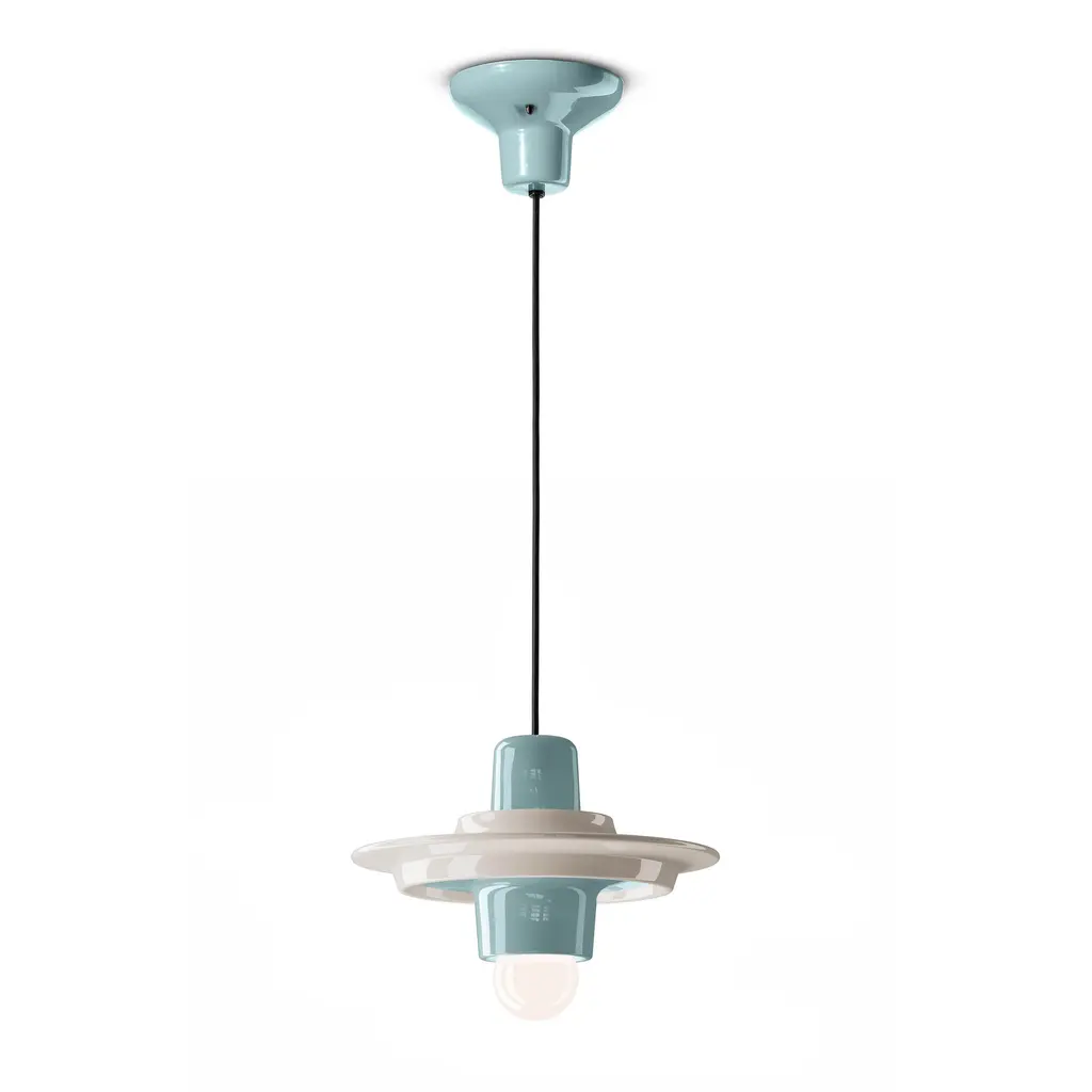 Add a touch of whimsy to your space with the Voila Pendant Light from Ferroluce. The deco-style ceramic lamp features a retro design that adds charm to any room. With its contrasting colors and elegant proportions, this pendant creates a soft and diffused light, making it perfect for kitchens and hallways. Use it as a statement piece or in series to brighten up medium spaces and long corridors. Highlights