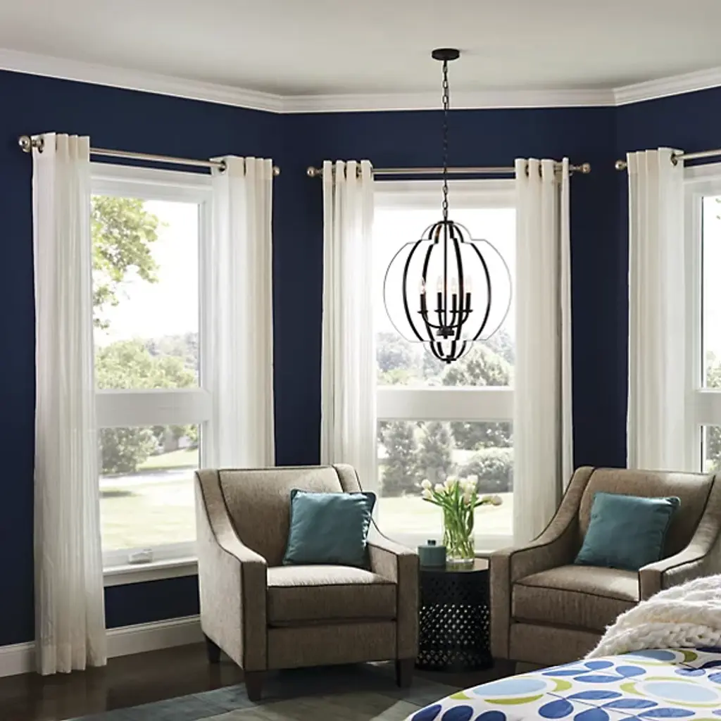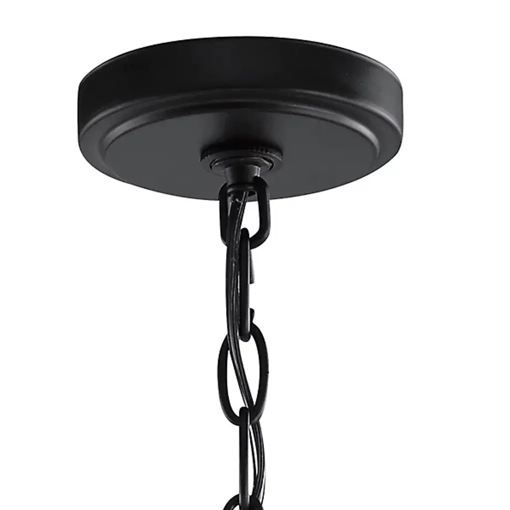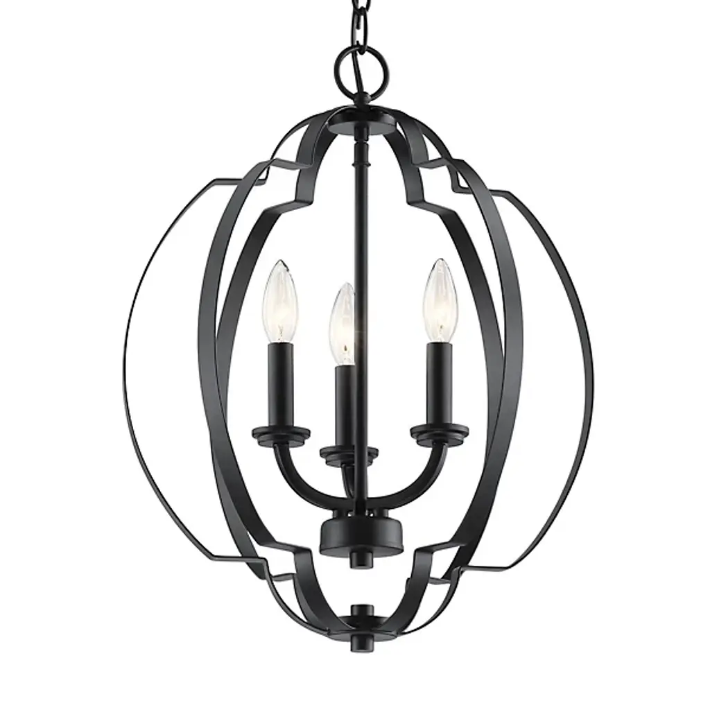 With a sense of visual motion that makes it almost seem to spin when still, the Voleta Pendant from Kichler is an intricate transitional piece sure to draw attention in any room it is installed. A disc-shaped ceiling mount drops a fine chain with a wire threaded through it, connecting to a central stem. The stem holds an upward-sweeping candelabra style lamping, surrounded by geometrically bent framing. This creates a spherical wireframe shape with depth and definition at the top and bottom, moving the eye down along it as the lamping shines out and down unrestrained by shade or diffuser.