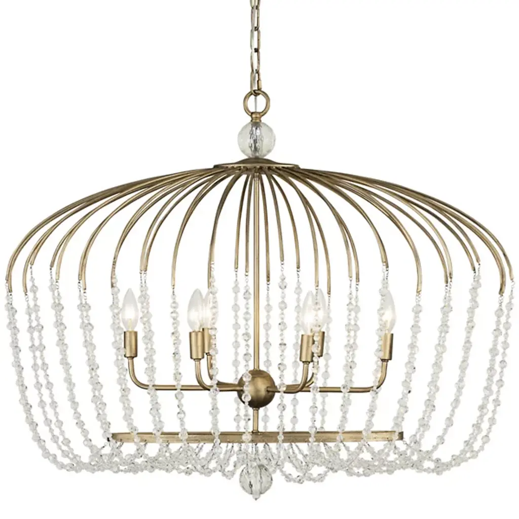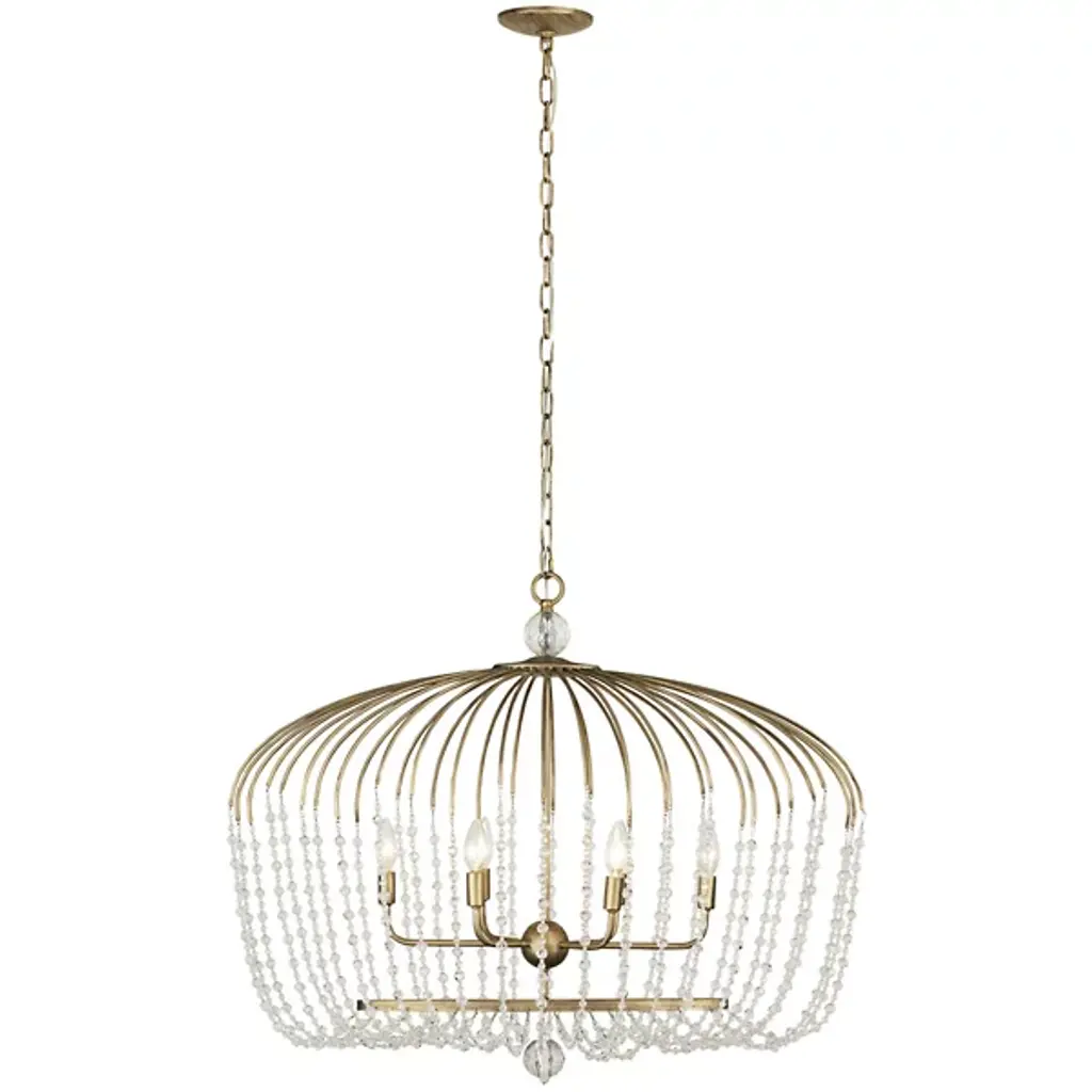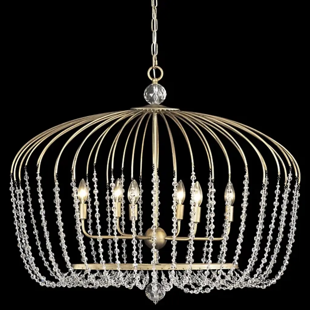 Airy and sparkling lighting design inspired by parasol frames. The Voliere Oval Pendant by Varaluz features a hand-forged recycled Steel frame made to look like the ribs of an umbrella. Surprisingly, those ribs turn into draping strands of high-quality Optic Crystal. The strands smoothly complete the curved lines begun by the frame and, surrounding the exposed bulbs within, turn the light they produce into a shimmering wash of useful ambience. Long and lean, this modern lighting design is the ideal touch of whimsy and glamour you need over a longer dining table or even a kitchen island.