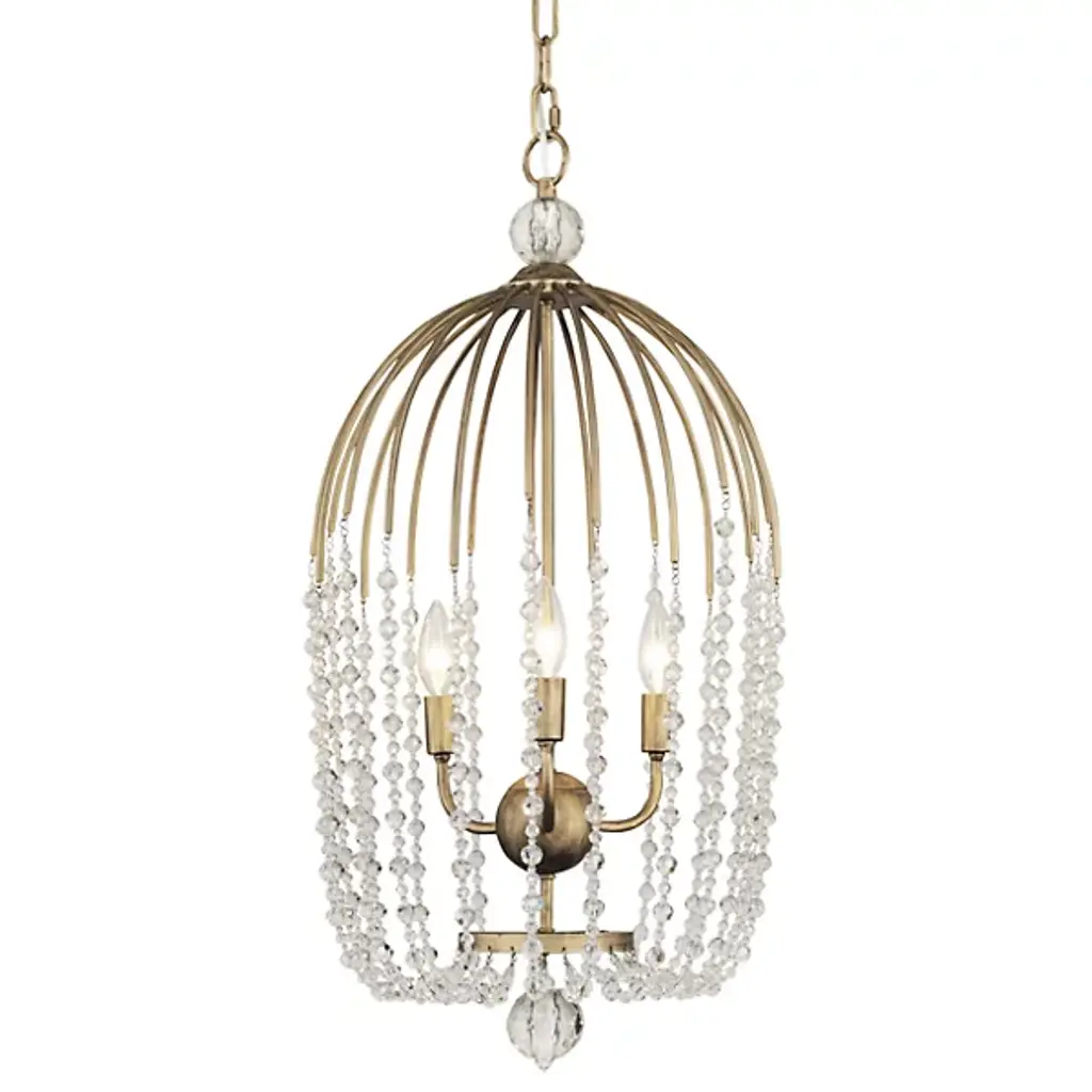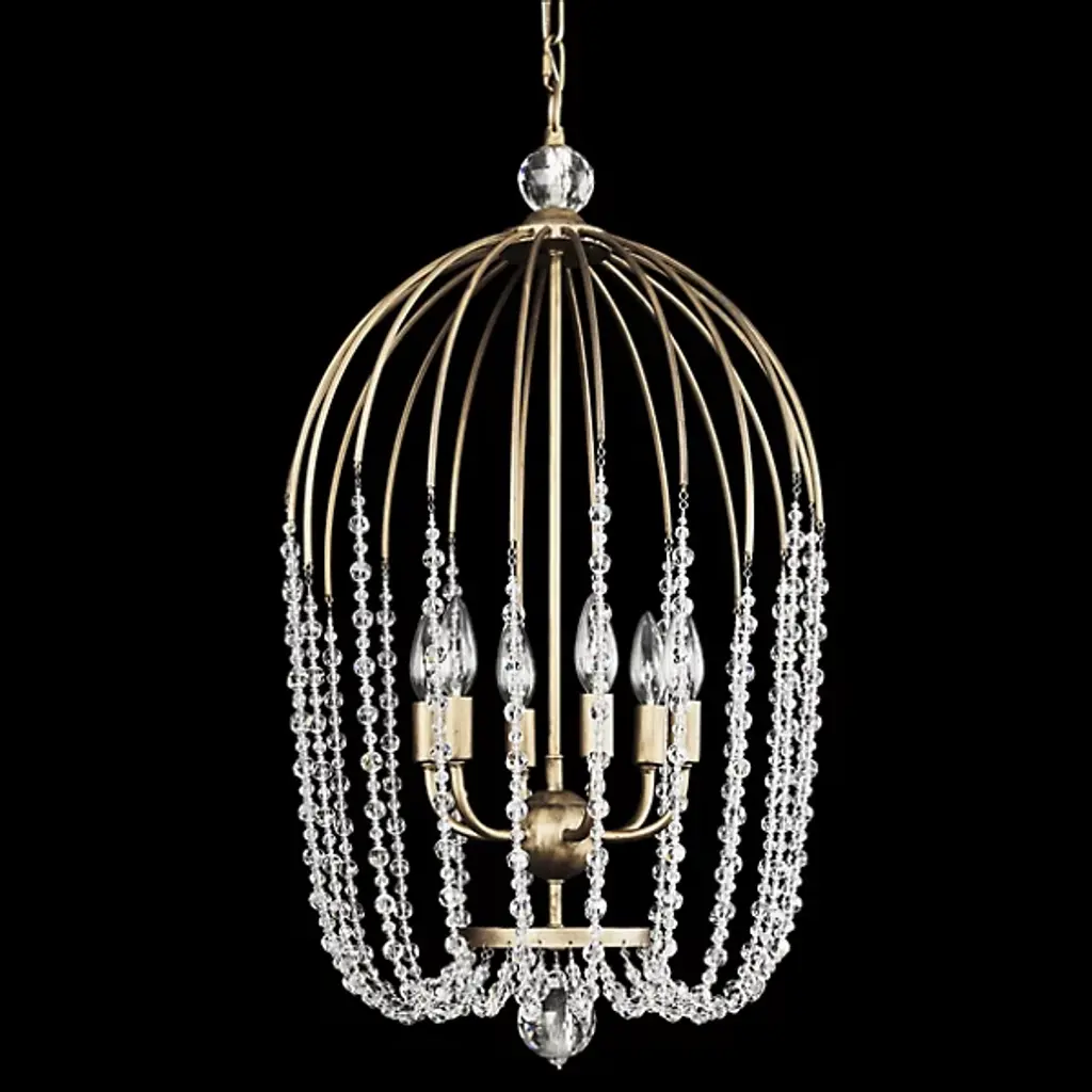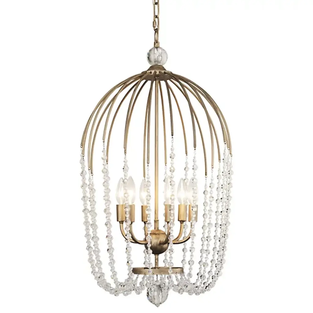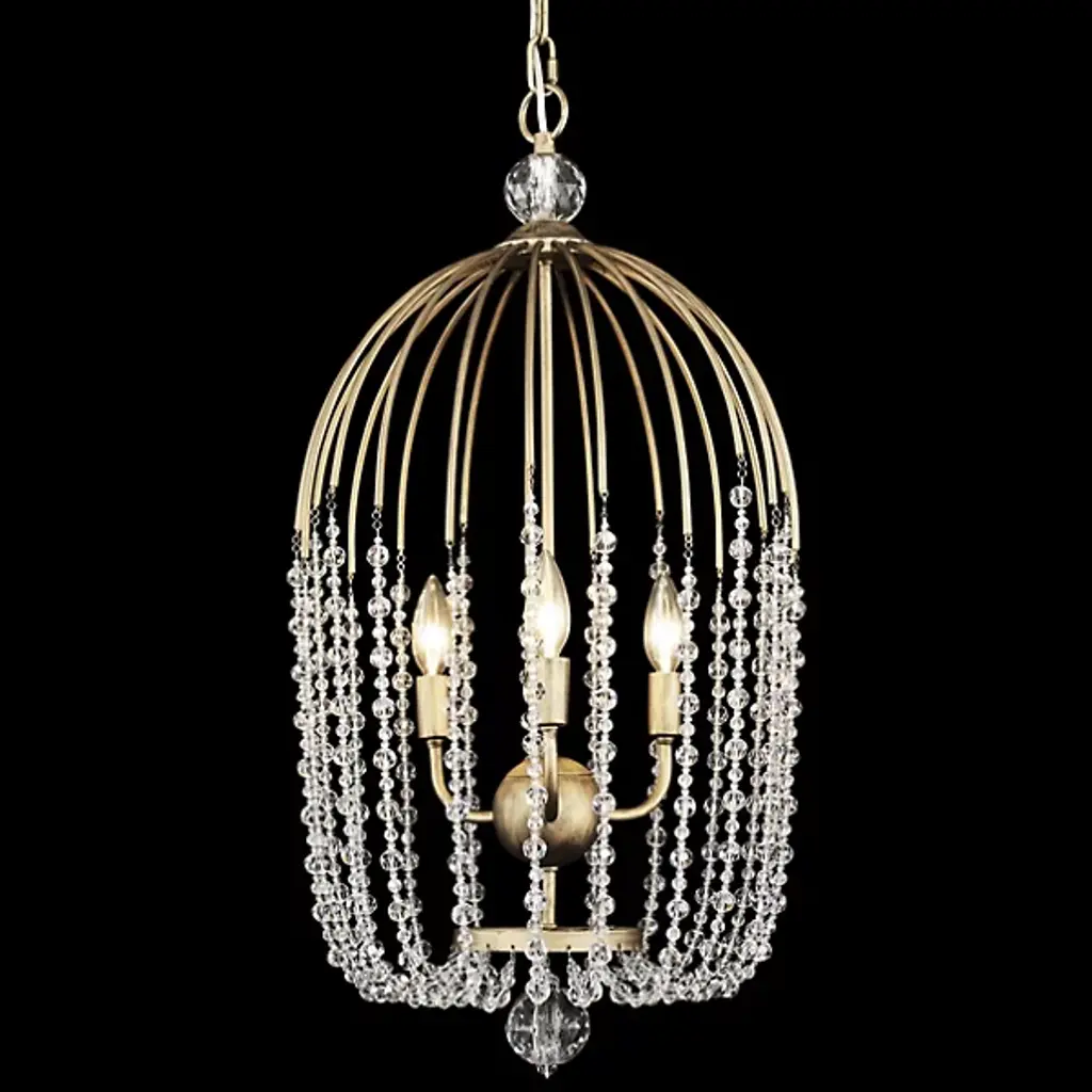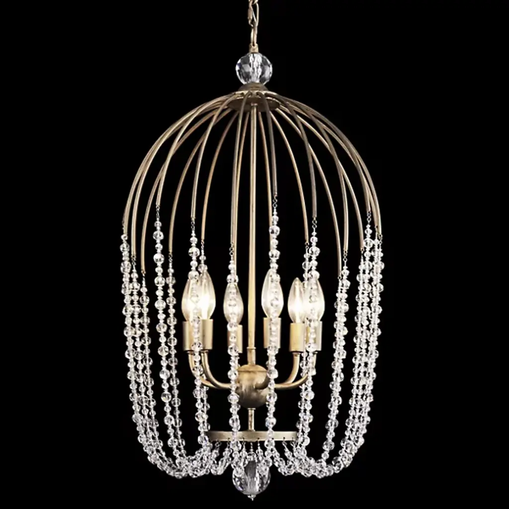 A sparklingly unique take on modern pendant lighting. The design of the Voliere Tall Pendant by Varaluz was inspired by umbrella cages, and the finished piece resembles a birdcage. The whimsical look is paired with similarly whimsical craftsmanship, starting with a hand-forged recycled Steel frame that unexpectedly segues into sparkling strands of clear Optic Crystal. The crystal completes the curved lines of the frame and enhances the light produced by the exposed bulbs inside. At once charming and modern, this distinctive pendant is a true conversation starter when installed over a dining table or in an entryway.