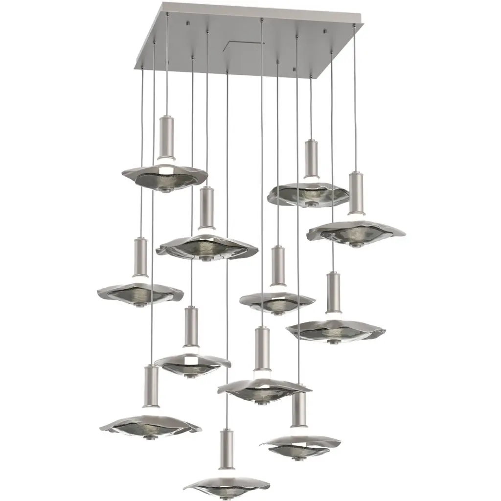 Our Volo Collection captures the quiet momentum of flight through cascading geometric forms and customizable, suspended compositions. Handcrafted studio glassavailable in clear, smoke, or amber with hammered or linear texturesevokes the interplay of win
