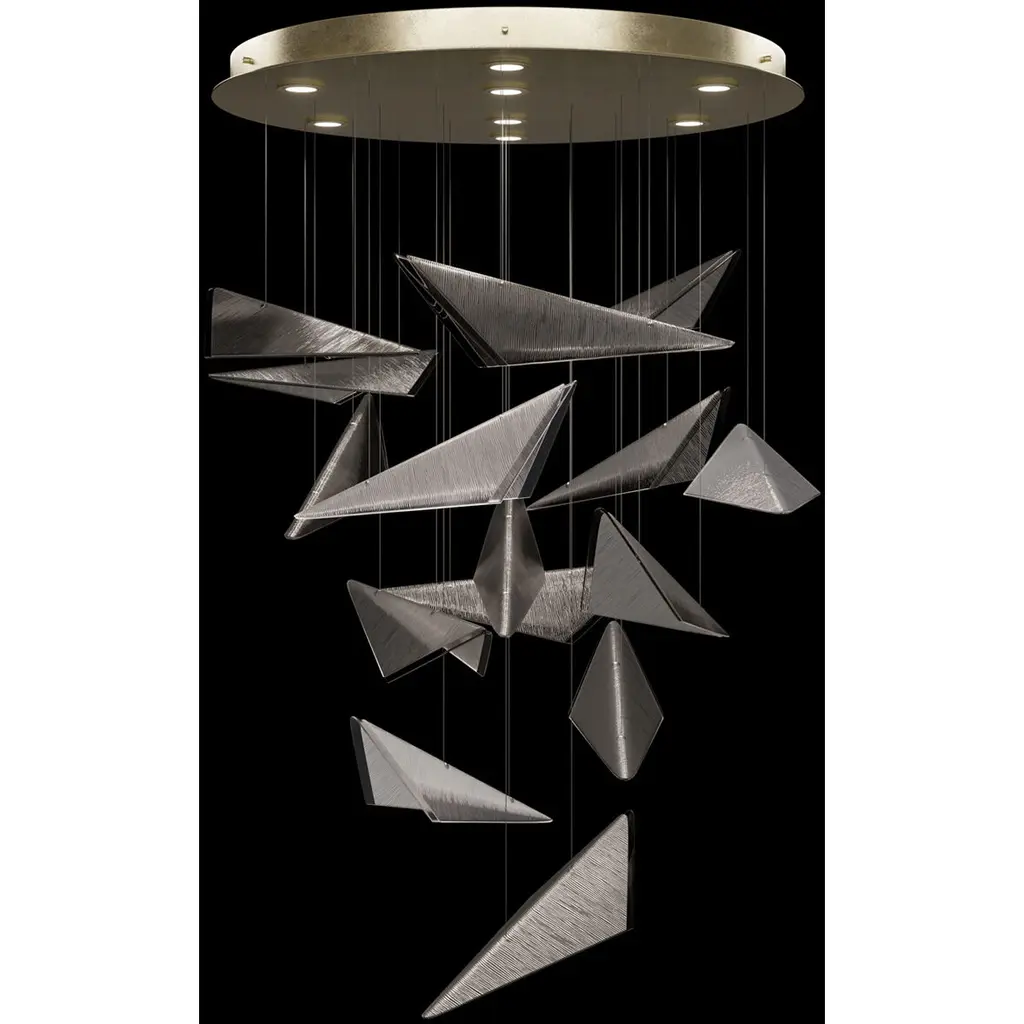 Our Volo Collection captures the quiet momentum of flight through cascading geometric forms and customizable, suspended compositions. Handcrafted studio glassavailable in clear, smoke, or amber with hammered or linear texturesevokes the interplay of win