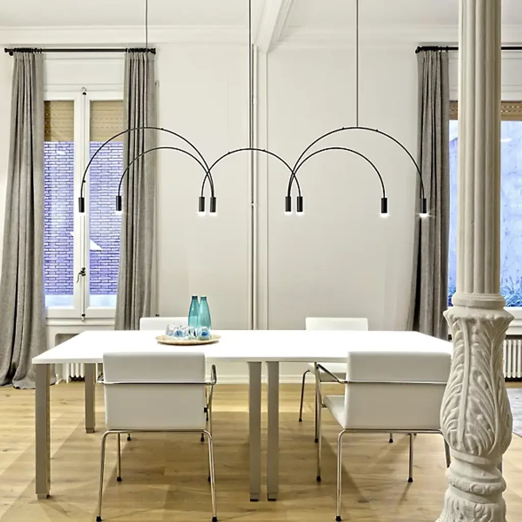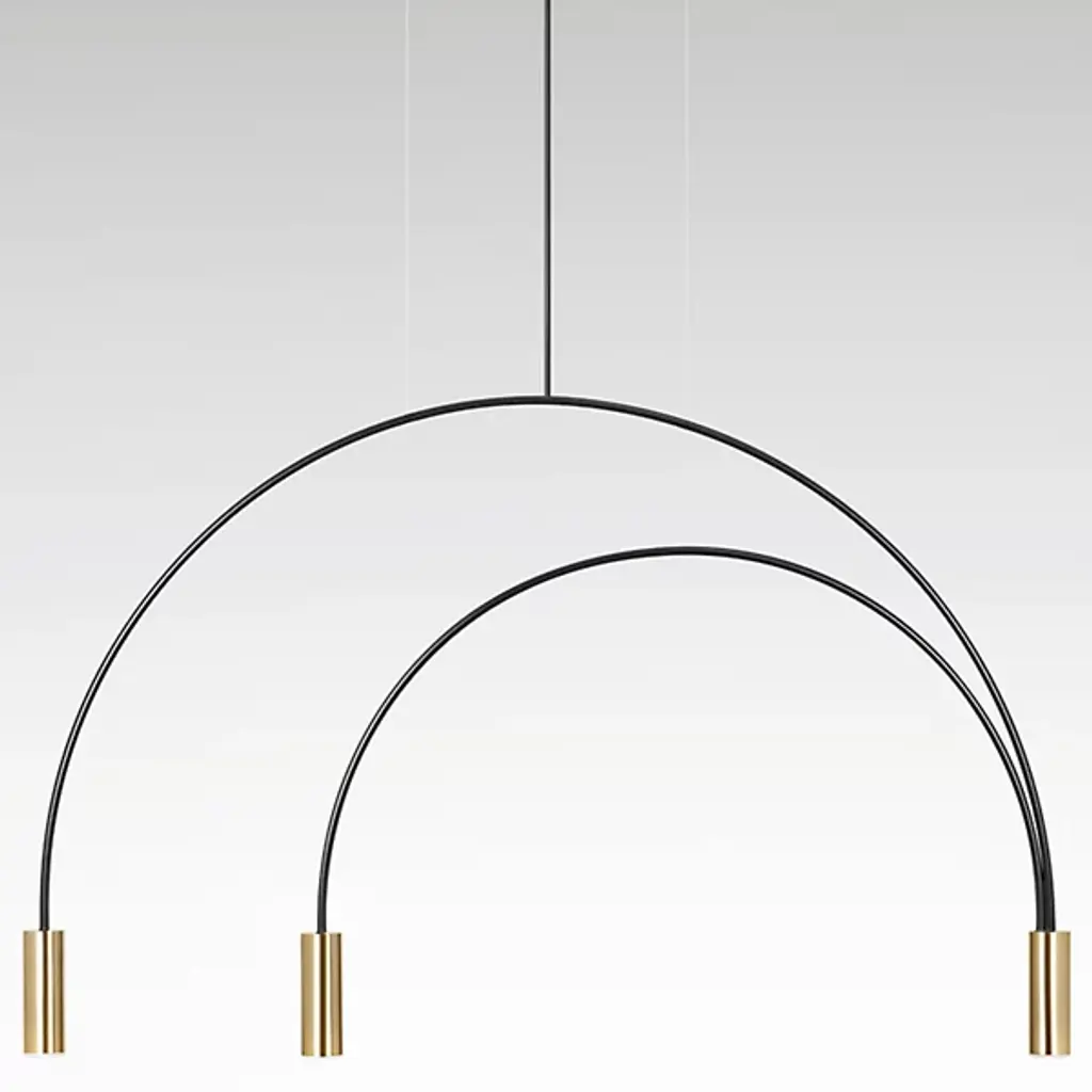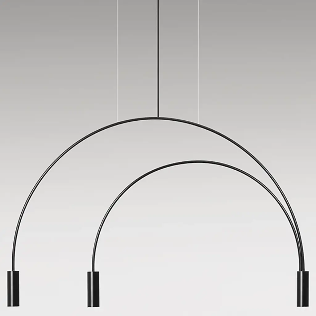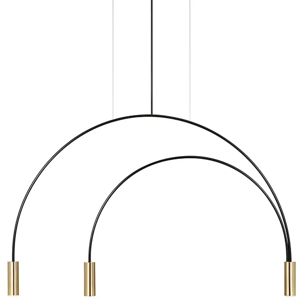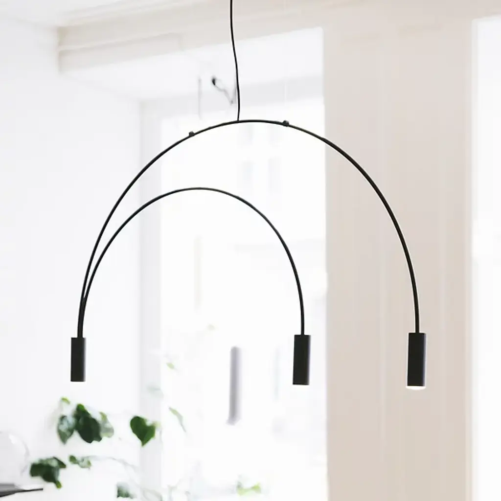Good things really do come in threes. The Volta Triple Pendant by Estiluz contains two asymmetrical arcs connected at a central point, one smaller than the other, creating a geometric shape with 3 light sources. The Steel canopy and Black frame are super sturdy, while the cylindrical Aluminum head at each end completes the look. Within each head is a 2700K color temperature LED system covered by a Methacrylate Optic lens to diffuse light into a warm glow. This pendant looks as good alone as it does in multiples. Place over a dining room table, kitchen island, or in a living room or bedroom for a focal point for a modern space.