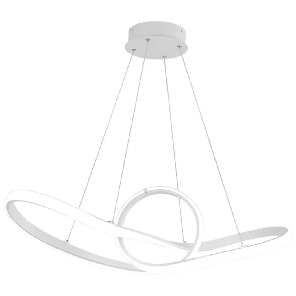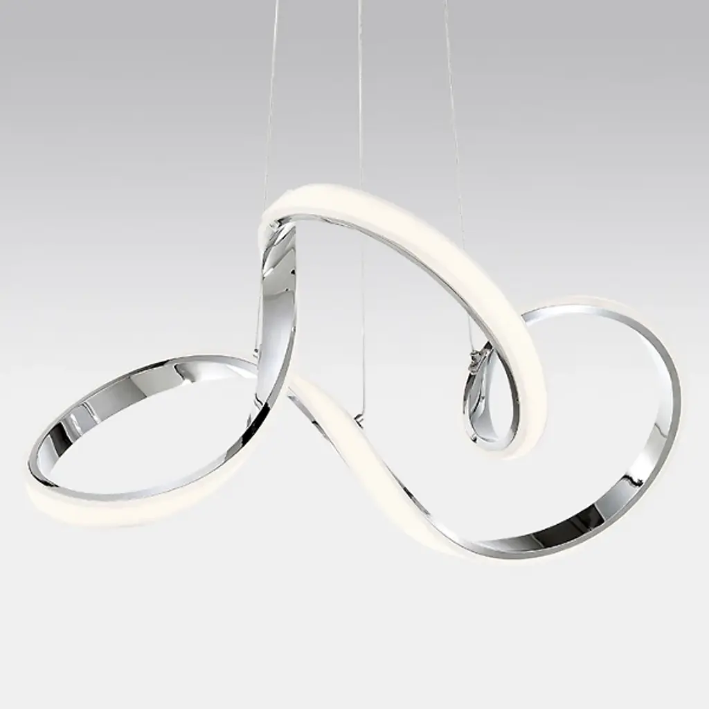 Free-flowing fixture with a warm glow. The Vornado 23-Inch LED Chandelier from dweLED has a sophisticated profile that looks enduring and elegant. Made from single-piece aluminum, this chandelier has loop-like strips that form the shade with an abundance of modern and chic. The integrated LED lamping from the shade radiates a soft white glow that emerges as an inviting stream of light in dining rooms, living rooms, and offices. Adjustable thin, low-profile cables create a hanging illusion of the fixture in mid-air, giving it a dramatic look.