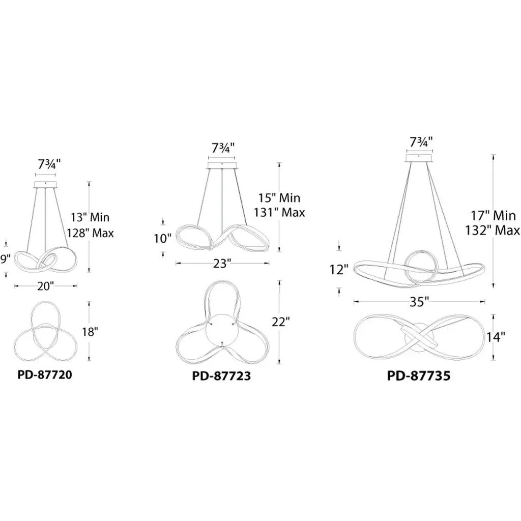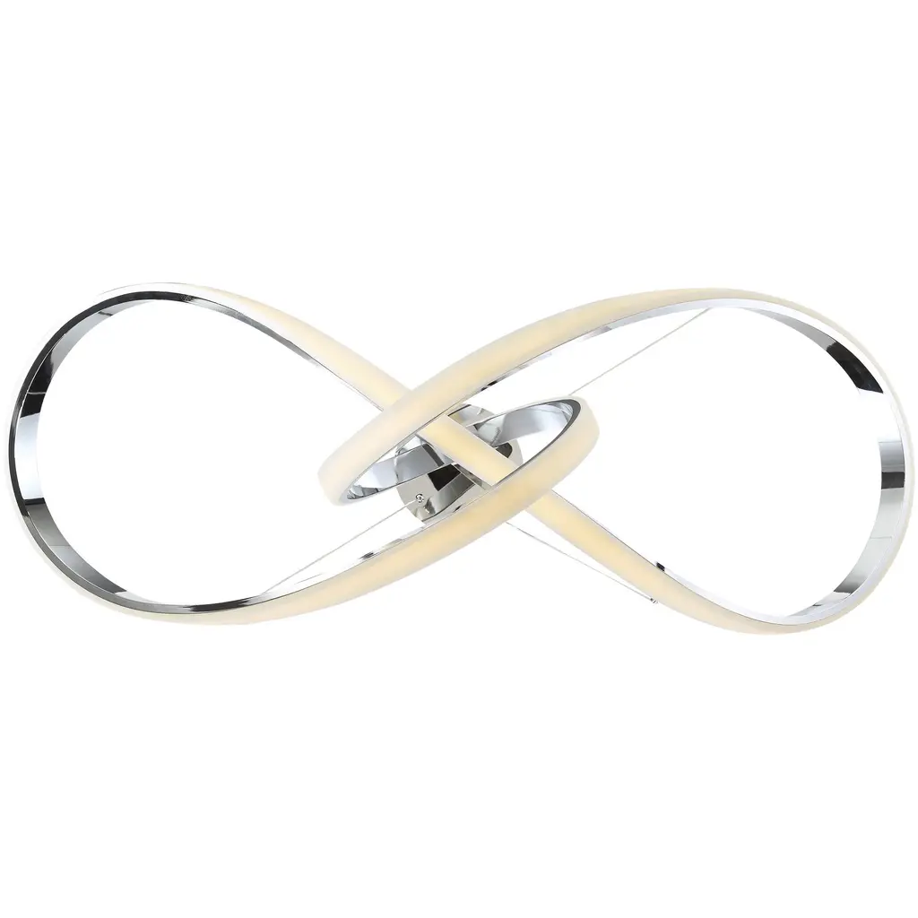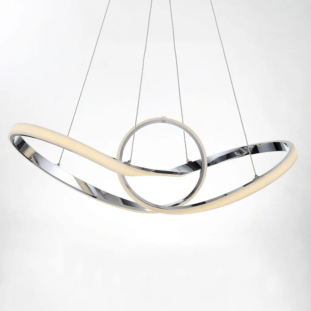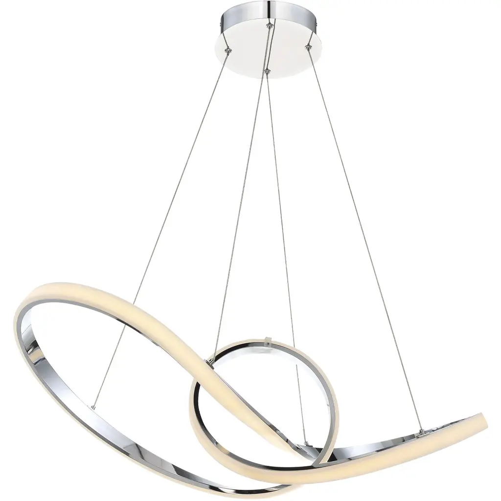 With its captivating and continuous loops, Vornado pushes the limits of engineering, bands of silver and light twist in and out like a Mobius strip on steroids. Finely wrought in spun aluminum and plated with chrome for extra shine. Energy efficient integrated LED's provide a long-lasting maintenance-free bright and even illumination. Thin coated electrified aircraft cables adjustable through push-pin connectors at the canopy provide an ultra-clean look.