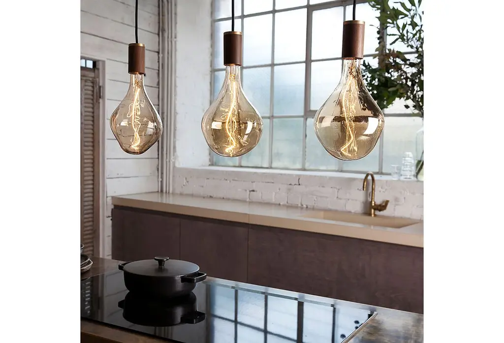 This simple pendant shows off the organic shape of what is the largest sculptural bulb made. The spiral filament, designed to mimic the Fibonacci sequence, is encased in mouth-blown glass. Its slight tint ensures a soft, flattering glow, while the brushed-brass trim adds a warm glimmer whether the light is on or off. With an equivalent incandescent power of 14W, this 3W LED bulb can reduce energy usage by up to 90%.