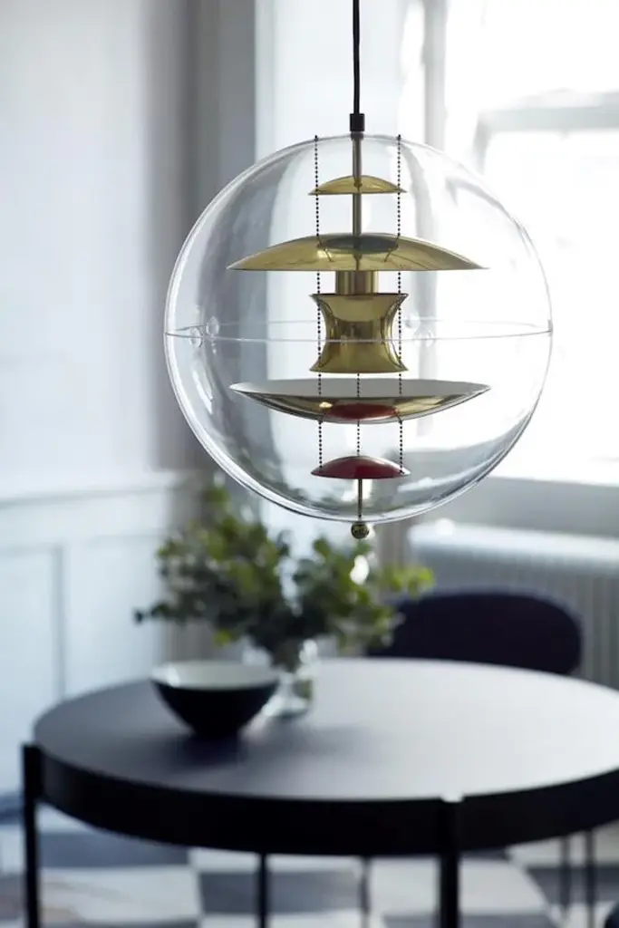 Pendant made of transparent acrylic. Five reflectors in hollowed-out Aluminum with lacquered brass, orange and blue. Suspended by three steel chains. Incl. ceiling canopy. Assembly instructions available here .