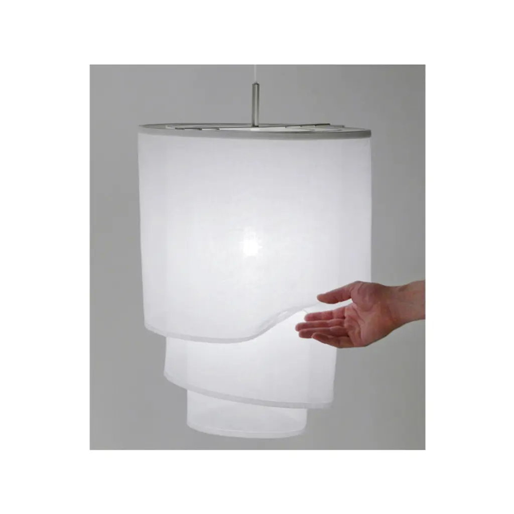 The shade part of the Vuolle ceiling lamp is a free hanging textile spiral. It gives a softly diffused light to the surrounding. The structural idea is based on a steel spiral where the textile is attached with a Velcro tape. The textile can be removed for cleaning and ironing.