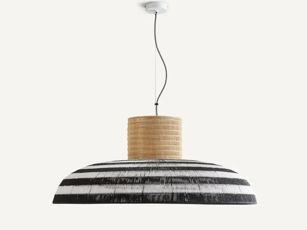 This stunning ceiling lamp is part of the Wagasa collection designed by Servomuto. Boasting elegant and sophisticated contrasts that will enliven both a classic and a contemporary decor, this lamp features a geometric silhouette that evokes Japanese minimalism. The larger ring is covered in Viennese straw, while the conical top and cylindrical bottom are upholstered in weightless rice paper, for a delicate shading effect. The electric system of the lamp is available only in the EU countries.