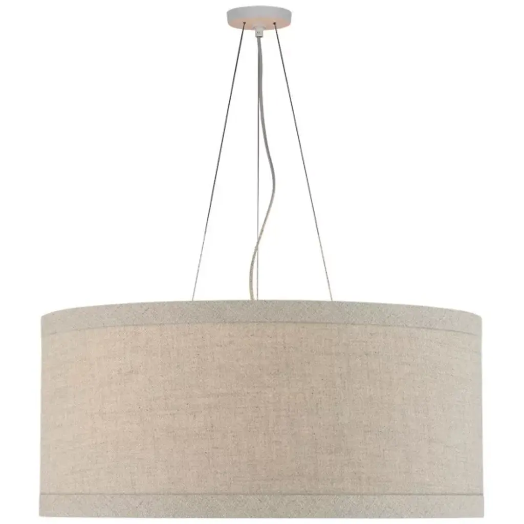 Make a simple, stately addition to inside ceilings with the Walker Drum Pendant from Visual Comfort Signature, formerly known as Visual Comfort, A simple and stylish design, it plays with negative space and clever curves, descending from a sleek circular canopy along three slim, strong cables, which seat bright, damp-listed lamping beneath a linen drum shade. This translucent material mellows bright glare, with the shade appearing to float in midair when lit and transmuting it into an even layer of light around the fixture.