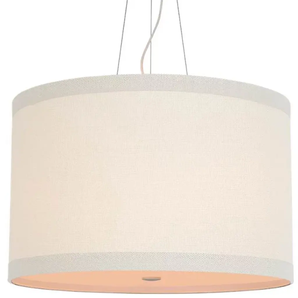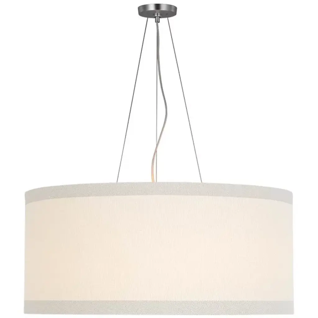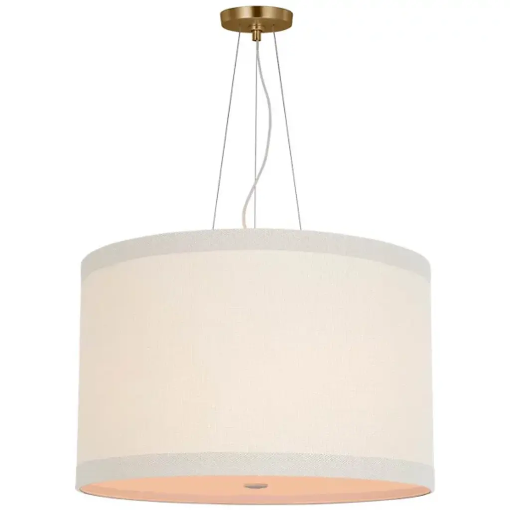 Make a simple, stately addition to inside ceilings with the Walker Drum Pendant from Visual Comfort Signature, formerly known as Visual Comfort, A simple and stylish design, it plays with negative space and clever curves, descending from a sleek circular canopy along three slim, strong cables, which seat bright, damp-listed lamping beneath a linen drum shade. This translucent material mellows bright glare, with the shade appearing to float in midair when lit and transmuting it into an even layer of light around the fixture.