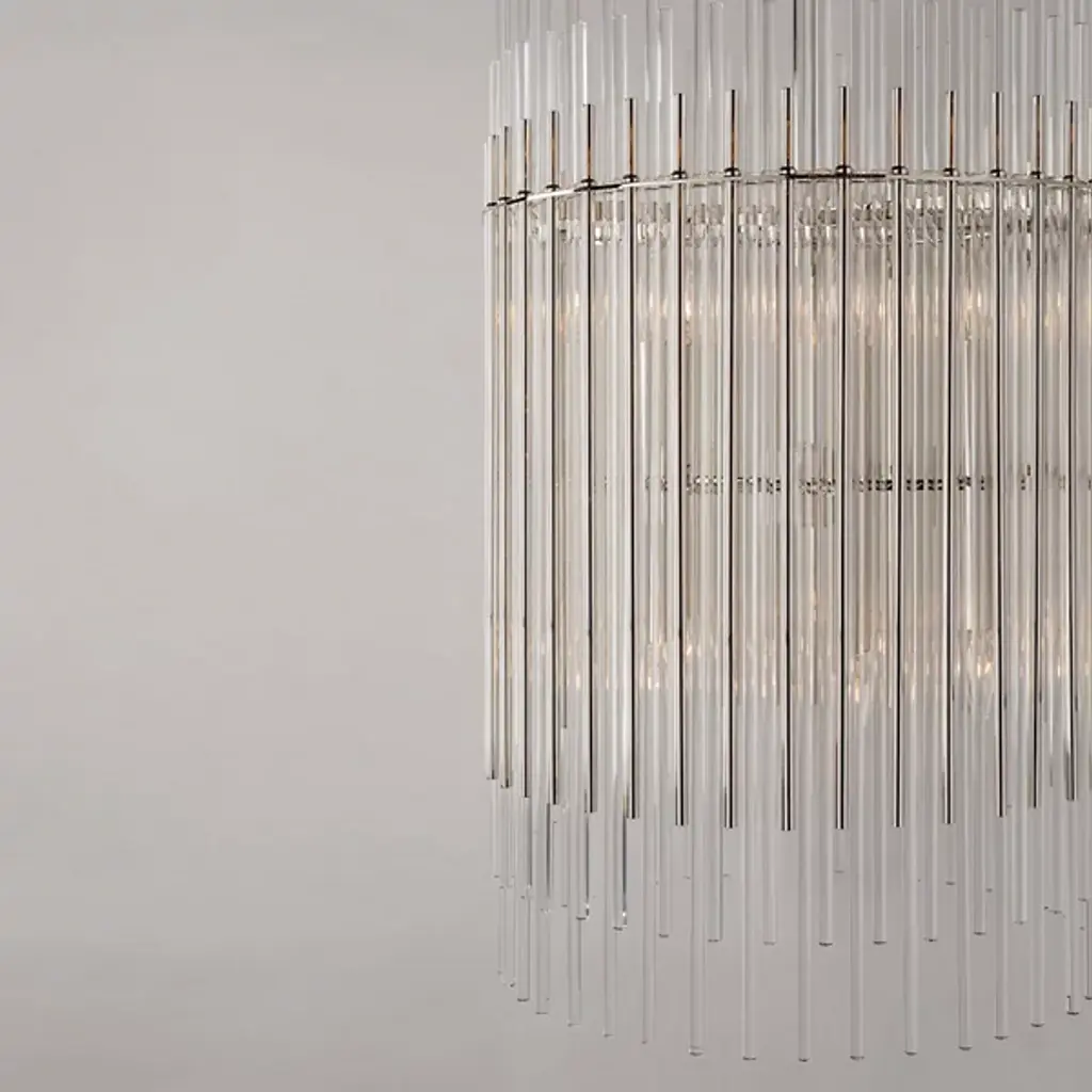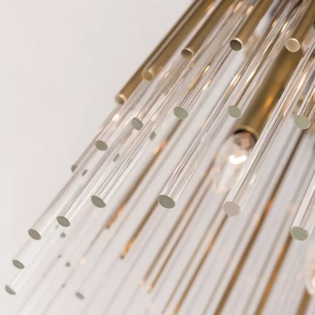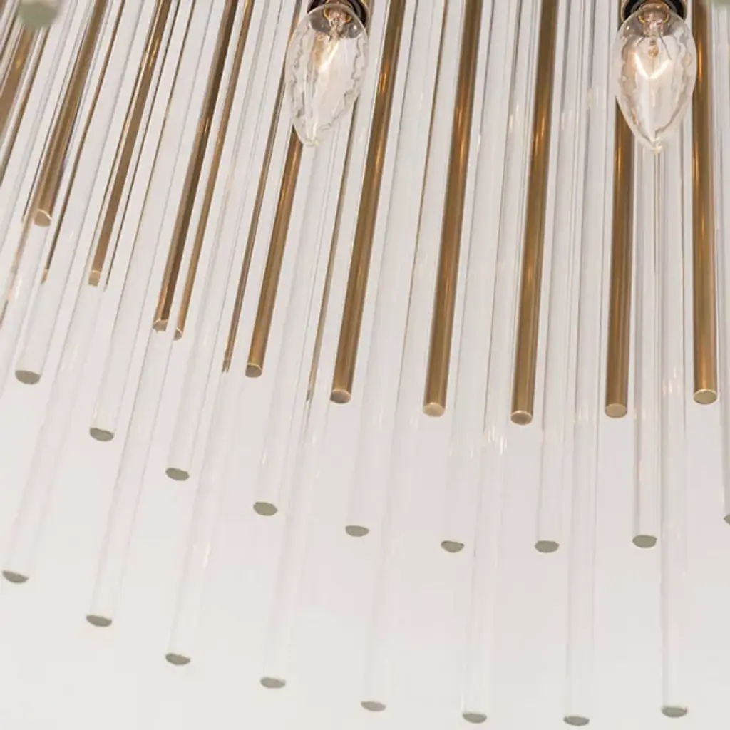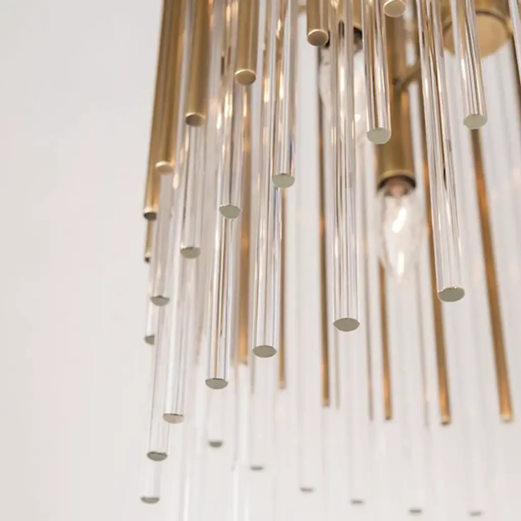 The Hudson Valley Wallis Pendant brings an interesting perspective to ceiling lights. Multiple glass and metal rods are layered at staggered but even lengths which draw the viewer's eye all throughout the piece. The illumination is diffused both horizontally and vertically; bringing a unique edge to pendant lighting.