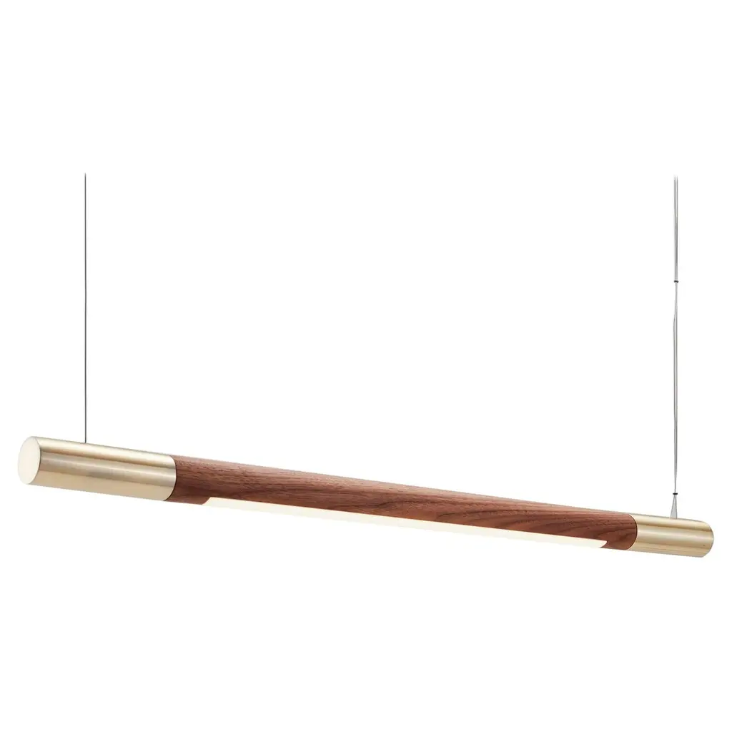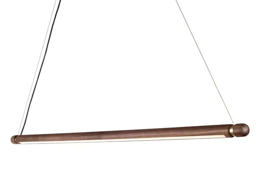 Walnut small Bennington up/down pendant by Hollis & MorrisDimensions: 4ft x 48" x diameter 2.25"Materials: Solid wood, hardwax oil. LED lights, powder-coated metal, or brushed metal finish.Also available in natural oak, black oak, white oak, and walnut. Black, white, or brushed metal powder-coated finish. Available in other sizes. All our lamps can be wired according to each country. If sold to the USA it will be wired for the USA for instance.A seamless suspension light with infinite applications. Offered in lengths ranging from three to eight feet, the Bennington is designed to support many environments. It shines as a distinct solitary light enriched by playful Scandinavian minimalism and can be combined into whimsical clusters that harken a vision of abstracted tree branches. Two-point suspension, 3000K Lighting Temperature.Based out of Toronto, Hollis & Morris takes its name from an intersection in Halifax where the company started as a series of garage explorations in design. A steadfast commitment to function with a distinctive approach to design. Hollis & Morris creates handmade furniture and lighting which carefully balances modern and honest designs. Versatile, well crafted, and timeless. Pieces by Hollis & Morris easily complement residential, commercial, and hospitality spaces. Driven by respect towards natural and honest processes, trademark integrations of solid wood and metal celebrate the inherent strengths of each material, resulting in thoughtful, quality pieces made to last with you throughout the years.